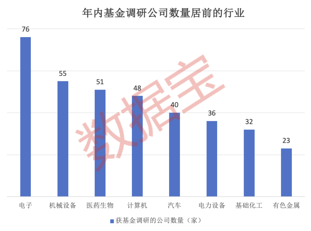 基金公司作为A股市场机构投资者的重要组成部分,其调研动态值得关注。 据证券时报·数据宝统计,今年以来,基金公司合计调研了549家上市公司。 从行业来看,电子、机械设备、医药生物、计算机、汽车等行业最受基金公司欢迎,均有超40家上市公司获得调研。 电子行业有76家公司获基金公司调研,是最受关注的行业;相比之下,煤炭、石油石化、非银金融、房地产行业获调研公司数量较少,不足5家。