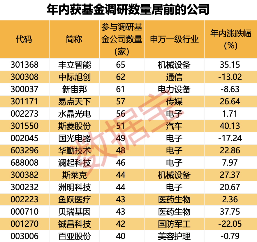 从参与调研的基金公司数量来看,13个行业参与调研的基金公司数破百家,其中电子、机械设备、医药生物、计算机的调研基金公司数量均超390家。 传媒行业获调研的公司数量仅7家,但参与调研的基金公司有131家,平均每家公司获得超18家基金公司调研。 机械设备行业的丰立智能获调研的基金公司家数最多,达65家。公司在1月21日共接待了237家机构调研,公司在调研中表示,2024年新增新能源传动智能和精密减速器的产品二大类,目前新增开发项目开始发力,公司以优良的产品品质获得客户的认可,目前订单量稳定并保持增长趋势。现继续追加设备投入,设备预计2025年上半年会逐步到位。 获基金公司调研数量前十位的公司中,以电子行业公司居多,包含水晶光电、国光电器、华勤技术、澜起科技。 水晶光电今年以来接待7次机构调研,参与调研的基金公司数量达56家,包括博时基金、华富基金、汇添富基金、中金基金等。公司表示,旋涂滤光片在北美大客户的所有机型的前后摄上已经实现了标配,但是过去主要是海外供应商供应,国内供应商主要提供镀膜端工序。2025年公司有望在涂胶端切入供应链,第一年公司首先要保证稳定的产品品质,并在其基础上逐年实现渗透率的提升。 15家公司获40家及以上基金公司扎堆调研。从行情表现来看,这些公司今年以来股价平均上涨10.73%,整体表现显著优于大盘。斯菱股份、贝瑞基因、丰立智能的股价年内涨幅居前,分别上涨40.13%、37.75%、35.15%。
