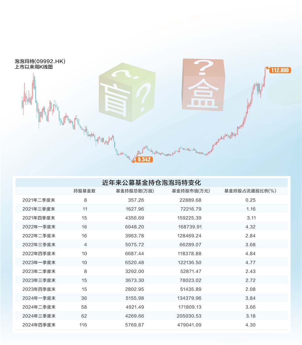 证券时报记者 陈书玉 泡泡玛特的再度崛起,是否挑战消费基金经理的“茅台信仰”? 在消费股失落的四年中,许多基金经理期盼着白酒王者归来,并带飞整个消费板块。如今,率先实现逆转的不是白酒,而是潮玩。 2020年末“潮玩第一股”泡泡玛特登陆港交所,上市首日市值突破千亿港元,迎来高光时刻;随后公司陷入“估值收缩、泡沫破灭”的质疑,股价一度跌入谷底;再后来凭借IP活力和海外破圈焕发新生,打了一场漂亮的翻身仗。2025年春节,泡泡玛特乘上《哪吒2》的东风,上演了一场“我命由我不由天”的逆袭。公司最新总市值已达1488亿港元,用四年时间走出U形反转。 泡泡玛特股价自低点反弹超10倍,2024年以来股价涨幅超4倍。然而大多数公募基金并未抓住这波上涨,背后有何原因?优质IP的巨大价值,将会带来哪些新的投资机会?随着Z世代崛起,情绪消费渐成“刚需”,消费投资逻辑是否生变? 1 “潮玩第一股”接住泼天富贵 这个春节档,电影《哪吒2》的持续出圈,让市场看到了优质IP的巨大潜力,不仅电影本身取得了斐然的票房成绩,同时还带动了IP衍生品的销售热潮。其中,泡泡玛特发售的《哪吒2》天生羁绊系列手办盲盒,上线8天销售额就冲破千万元大关,接住了这场“泼天富贵”。 受到电影热度及联名手办热销影响,泡泡玛特股价近期表现持续亮眼,2月14日,泡泡玛特大涨7.26%,报收110.8港元/股,创下历史新高,总市值达1488亿港元。 “泡泡玛特的成功很大程度上归功于强大的IP孵化和运营能力。通过与众多知名IP的合作,泡泡玛特不仅丰富了自己的产品线,还能够快速响应市场变化,推出符合消费者需求的新产品,这次踩中《哪吒2》的风口正印证了这一点。”沪上一位基金经理表示。 “股价都是跟着数据走的,数据好且不断上修,股价自然就会涨。”一位“90后”基金经理对证券时报记者表示,自己长期追踪潮玩行业,继续看好公司未来业务增长的持续驱动力。一方面,看好公司在IP储备、渠道布局、品牌影响力等方面的优势;另一方面,公司的全球化布局将推动海外业务高增长,公司自2021年开始布局海外渠道,截至2024年上半年,出海收入占比接近30%,管理层表示2025年将在更多重要城市及地标布局,海外业务占比可能超过50%。财报显示,泡泡玛特2024年上半年实现营收45.6亿元,同比增长62.0%,经调整后净利10.2亿元,同比增长90.1%。第三季度,公司整体收益同比增长120%—125%。 “泡泡玛特的IP飞轮已经开始转动,加上全球扩张策略,泡泡玛特将成为全球主要IP所有者的首选合作伙伴之一。”摩根士丹利在最新报告中表示,《哪吒2》不仅为泡泡玛特带来良好的营收贡献,亦彰显该公司在IP业务上的影响力。投资者不应只盯着泡泡玛特单一IP产品的销售业绩,更应关注其持续的产品创新能力和不断拓展的IP合作网络。正是泡泡玛特自身独特的创造力、成熟的商业生态系统,以及不断强化的“IP—产品”飞轮效应和稳步推进的全球扩张策略,共同驱动着公司的高速增长。 值得一提的是,2024年以来,IP经济受到持续关注,德邦基金朱慧玲表示,IP经济的成功关键在于以IP为核心壁垒,布局全产业链,强化产品开发、设计和制造流程,不断提升消费者触达能力,从而增强品牌影响力并增加用户黏性。新风口的主题投资能否演化成长线投资,核心在于产业的发展阶段和个股公司的核心竞争力。当前在行业发展初期阶段,市场集中度较低,全产业链的企业能够享受到行业贝塔,从中长期来看,需要优选具有IP储备、制造研发和营销推广方面具有差异化优势的公司。 2 多数公募基金错失大反弹 头顶光环出道,历经至暗时刻,如今“涅槃重生”,四年多的时间里,泡泡玛特股价走出一个U形。在这个过程中,公募基金与泡泡玛特经历“分分合合”,却几乎错失了这一波大反弹。 2020年12月11日,泡泡玛特在港交所挂牌上市,开盘高开超100%,市值突破千亿港元,一时风光无限。随后近两年时间,泡泡玛特股价震荡下行,2022年10月底,公司市值较巅峰时期减少超90%。 2023年,泡泡玛特股价全年窄幅震荡,2024年以来,随着品类扩张和出海带动增长,泡泡玛特股价一路上涨,截至今年2月14日最新市值达1488亿港元,较市值最低点时增长超10倍。 公募基金投资泡泡玛特始于2021年二季度,到2022年一季度末时,共有16只基金持仓6048.2万股,达到小峰值。但随着股价的一路下跌,基金纷纷选择割肉离场,截至2022年三季度末,仅余4只基金持仓,包括东方红资产旗下东方红睿泽三年持有、东方红智远三年持有、东方红睿满沪港深3只产品。 也正是在此期间,两位消费领域知名基金经理张坤、萧楠纷纷“折戟”。萧楠于2021年三季度开始买入,截至四季度末其管理的易方达高质量严选三年持有、易方达消费精选两只基金合计持有2594.86万股,占公募持仓泡泡玛特的一半以上。张坤则是在2022年一季度买入,截至一季度末易方达亚洲精选持有600万股。面对股价的持续震荡下跌,2022年二季度末时,萧楠全部清仓,三季度末时,张坤全部清仓。张坤此后再未买入该股,而萧楠在2024年四季度再次买入,截至2024年四季度末易方达消费行业持仓206.22万股。 从最低点算起,泡泡玛特本轮股价反弹超10倍,2024年以来涨幅也超过4倍,然而却鲜有基金经理捕捉到这段U形反弹。前述在底部依然坚持的东方红资产旗下3只产品,有2只在2023年二季度进行清仓,1只自2023年三季度开始减仓,