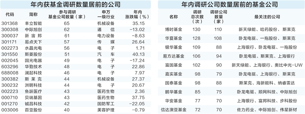 证券时报记者 郭洁 基金公司作为A股市场机构投资者的重要组成部分,调研动态值得关注。据证券时报·数据宝统计,今年以来基金公司合计调研了549家上市公司。 电子行业最受关注 从行业来看,电子、机械设备、医药生物、计算机、汽车等行业最受基金公司欢迎,均有超40家上市公司获得调研。电子行业有76家公司获基金公司调研,是最受关注的行业;相比之下,煤炭、石油石化、非银金融、房地产行业获调研公司数量较少,均不足5家。 从参与调研的基金公司数量来看,13个行业参与调研的基金公司数破百家,其中电子、机械设备、医药生物、计算机的调研基金公司数量均超390家。传媒行业获调研的公司数量仅7家,但参与调研的基金公司有131家,平均每家公司获得超18家基金公司调研。 机械设备行业的丰立智能获调研的基金公司家数最多,达65家,公司在1月21日共接待了237家机构调研。公司在调研中表示,2024年新增新能源传动智能和精密减速器二大类的产品,目前新增开发项目开始发力,公司以优良的产品品质获得客户的认可,目前订单量稳定并保持增长趋势。现继续追加设备投入,设备预计2025年上半年会逐步到位。 15家公司获扎堆调研 15家上市公司获40家及以上基金公司扎堆调研。从行情表现来看,这些公司今年以来股价平均上涨10.73%,整体表现显著优于大盘。斯菱股份、贝瑞基因、丰立智能的股价年内涨幅居前,分别上涨40.13%、37.75%、35.15%。 获基金公司调研数量前十位的公司中,以电子行业公司居多,包含水晶光电、国光电器、华勤技术、澜起科技。 水晶光电今年以来接待7次机构调研,参与调研的基金公司数量达56家,包括博时基金、华富基金、汇添富基金、中金基金等。公司表示,旋涂滤光片在北美大客户的所有机型前后摄上已经实现了标配,但是过去主要是海外供应商供应,国内供应商主要提供镀膜端工序。2025年公司有望在涂胶端切入供应链,第一年公司首先要保证稳定的产品品质,并在此基础上逐年实现渗透率的提升。 10家基金公司调研最积极 据数据宝统计,今年以来,合计有168家基金公司参与了调研。以调研次数看,博时基金、华夏基金、银华基金、易方达基金、富国基金等5家公司调研次数最多,均超过100次。 10家基金公司年内调研超过70家上市公司。博时基金年内调研上市公司数量最多,达110家,新天绿能、哈药股份、斯莱克是其最关注的三家公司。博时基金调研的公司中,电子、计算机行业的公司均占15家,调研后行情表现较好的有祥鑫科技、云天励飞-U、斯莱克,股价上涨幅度均超40%。 祥鑫科技是博时基金调研后市场表现最好的股票,1月14日接待机构调研以来,公司股价累计上涨48.92%。调研信息显示,人形机器人是祥鑫科技未来重要的战略布局方向之一,公司能够为客户提供从模具到结构件的产品整体解决方案。同时,公司致力于围绕客户需求进行产业配套,并在项目初期就与客户共同开发,提供全面的技术解决方案以满足客户需求。此外,机器人产业链与电动车零部件产业链在技术上有较高的重叠度,公司的部分客户已涉足机器人业务。祥鑫科技也在密切关注机器人行业的发展趋势和市场情况,并提前进行战略布局,以满足客户的多样化需求。 (本版专题数据由证券时报中心数据库提供) |