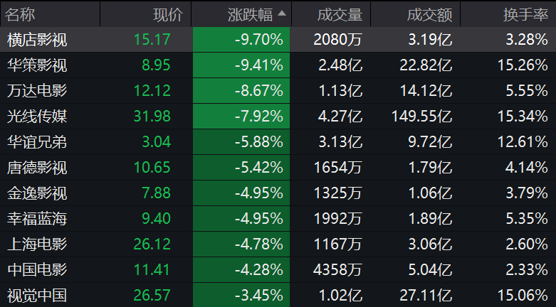 光线传媒触及涨停后快速跳水,股价一度逼近跌停,上演“准天地板”,早盘成交额149.55亿元。光线传媒的下挫带动影视股整体震荡走低,横店影视、华策影视、博纳影业、万达电影等股均跌超8%。