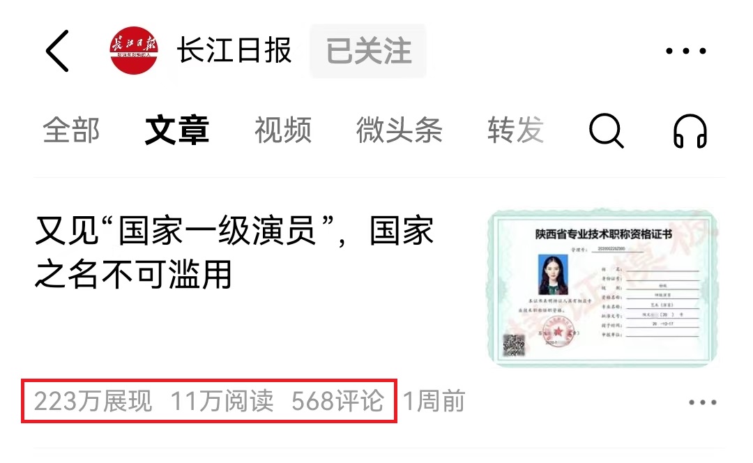 “文艺陕西”微信公众号上公布的艺术系列职称名称。 一名人力资源和社会保障部门的相关人士介绍,各地职称评审评出的“一级演员”等艺术系列正高职称,无论是公示的信息还是最后出具的文件、证书,都没有冠以“国家”。 对于职称名称滥用国家之名的现状,一名艺术领域的专家直言:很显然,有“国家”二字和没有“国家”二字是不一样的,加上“国家”二字显得“高大上”,这背后反映出的是严重的功利思想和心态的浮躁。 2月9日,长江日报大武汉客户端刊发的一文《又见“国家一级演员”,国家之名不可滥用》引发广泛社会关注,“中国晚协”公众号、中国江西网、中国宁波网、西安新闻网、湖南广播电视台都市频道“芒果都市”公众号、“编采圈”公众号等转发。