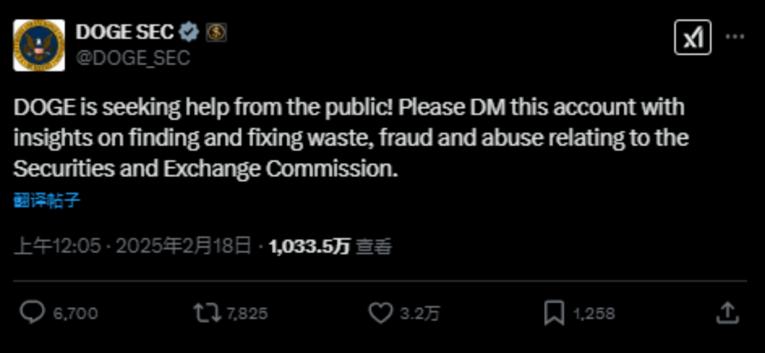马斯克,又爆出新消息! 据最新消息,马斯克领导的“政府效率部”又有了新的目标——美国证监会(SEC)。当地时间2月18日,“政府效率部”在社交平台X上发帖,让网友提供有关发现和解决与美国证监会有关的浪费、欺诈和滥用的见解。目前,该帖子下面已经有6700多条留言。 日前,马斯克还质疑,美国社会保障系统疑似存在史上最大规模欺诈行为:超3.94亿人领取社保,其中百岁以上老人超过2000万,甚至有人年龄高达360岁。马斯克戏称:也许《暮光之城》是真的,有很多吸血鬼在领取社会保障金。”不过,对于“百岁老人扎堆领钱”的荒诞现象,技术界提出另一种解释:老旧COBOL系统的日期编码漏洞。 另据外媒报道,近日,美国政府紧急“召回”了国家核安全管理局(NNSA)一批刚刚被辞退的员工。据了解,这些人员中不仅包括资历丰富的核专家,很多人还持有较高的政府涉密权限。 马斯克的新目标:美国证监会 最近,随着美国总统特朗普加速缩减政府人员,马斯克领导的政府效率部(DOGE)已开始推动大规模裁减联邦政府雇员。而最新消息显示, 马斯克又盯上了美国证监会。 当地时间2月18日,“政府效率部”在一个专注于该机构的附属帐户上发帖称:“DOGE正在向公众寻求帮助!请向此帐户发送DM以提供有关发现和解决与美国证监会相关的浪费、欺诈和滥用的见解。”截至目前,该帖子已获得1000万次浏览和超过3.2万个赞,以及6700条留言。马斯克则发布了一个戴着太阳镜的笑脸表情符号作为回应。
