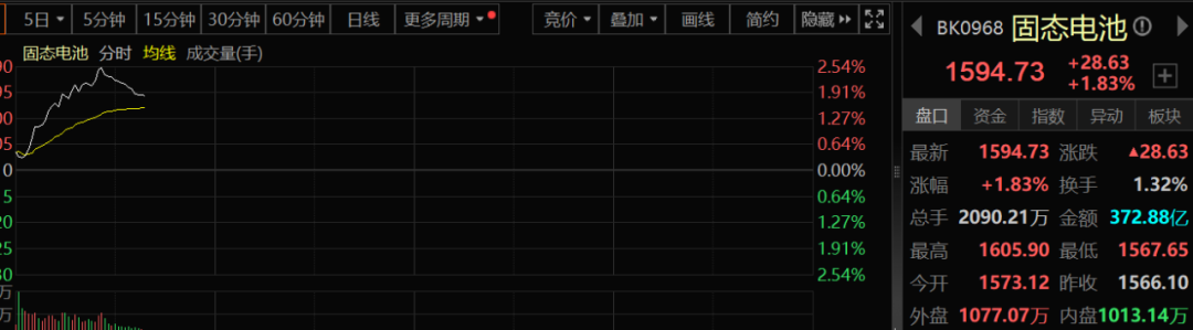 结构性机会持续演绎! 今天早盘,固态电池板块彻底爆发。星云股份、杉杉股份、传艺科技、山东章鼓、龙蟠科技等多股一度涨停,利元亨、鹏辉能源涨超7%。而从港股市场来看,龙蟠科技一度涨超30%,瑞浦兰钧、比亚迪股份、赣锋锂业等涨幅亦比较大。 分析人士认为,主要有三大利好: 首先,工信部等八部门印发《新型储能制造业高质量发展行动方案》,其中提出,到2027年,我国新型储能制造业全链条国际竞争优势凸显,优势企业梯队进一步壮大,产业创新力和综合竞争力显著提升,实现高端化、智能化、绿色化发展。 其次,深圳市比亚迪锂电池有限公司CTO孙华军在第二届中国全固态电池创新发展高峰论坛上透露,比亚迪将在2027年左右启动全固态电池批量示范装车应用,2030年后实现大规模上车。 第三,光大证券研报称,市场低估了全固态电池在人形机器人、低空经济需求放量后,对安全及续航方面的支持。 固态电池爆发 今天早盘,很多前期的热门股开始退潮,但固态电池爆发。星云股份、杉杉股份、传艺科技、山东章鼓、龙蟠科技等多股一度涨停。固态电池指数一度大涨超2%,远远要好于大市的表现。