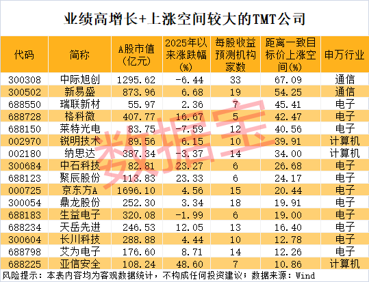 正丹股份净利润增速仍高居第一位,业绩大增与主营产品价格大幅上升有关。公司预计2024年净利润为11亿元至13亿元,同比增长110.39倍至130.64倍。报告期内,公司主要产品TMA和TOTM产销量较上年大幅增长,销售单价大幅上升,且单位成本基本保持稳定,酸酐及酯类业务营业收入和利润同比大幅增长,使得净利润大幅增长。 思特威-W预计2024年净利润为3.71亿元至4.17亿元,同比增长25.12倍至28.3倍。报告期内,公司在智慧安防领域新推出的迭代产品销量有较大的上升,应用于高阶旗舰手机主摄、广角、长焦和前摄镜头的数颗高阶5000万像素产品、应用于普通智能手机主摄的5000万像素高性价比产品,以及应用于智能驾驶(包括环视、周视和前视)和舱内等多款产品出货量均同比大幅上升。 华北制药预计2024年净利润为1.25亿元左右,同比增长25.56倍。报告期内,公司通过调整产品结构,加强采购管理,降低采购成本,推行精益管理,深挖成本费用管控等措施,实现盈利能力提升。 科技板块引领市场修复,高成长股揭晓 节后,以DeepSeek为代表的科技板块引领市场修复,产业新逻辑下投资者情绪高涨。华泰证券表示,DeepSeek带来的不仅仅是科技资产的重估,在从1到100的过程中诸多板块或都将受益,生产效率的提升带来的是全社会利润率的改善。科技巨头的重估有望逐步扩散至其他板块,这虽会带来短期市场扰动,但中长期看中国资产重估将进入新阶段。 长江证券认为,随着两会临近,市场政策预期升温,海外方面美国关税政策落地,美元与美债回落,市场风险偏好开始回升,同时国内降准降息预期仍在,流动性环境逐渐充裕,市场有望迎来“春节躁动”行情。从历史经验来看,在大部分出现“春季躁动”行情的年份中,A股市场指数在该阶段的涨幅会超过全年涨跌幅,近几年TMT在“春季躁动”行情中逐渐占优。 据数据宝统计,上述业绩翻倍的公司中,有137家公司属于TMT板块(含计算机、电子、通信、传媒行业),三大千亿市值的科技龙头公司榜上有名,分别是京东方A、韦尔股份、中际旭创。 京东方A预计2024年净利润为52亿元至55亿元,同比增长104%至116%;韦尔股份预计2024年净利润为31.55亿元至33.55亿元,同比增长467.88%至503.88%;中际旭创预计2024年净利润为46亿元至58亿元,同比增长111.64%至166.85%。 从二级市场表现来看,截至2月17日收盘,这些高增长科技股今年以来平均上涨16.23%,大幅跑赢同期上证指数。拉长周期来看,不少公司股价处在相对较低位置。据数据宝统计,以2月17日收盘价与5家以上机构一致预测的目标价相比,16家公司股价上涨空间逾10%。中际旭创、新易盛、瑞联新材、格科微、莱特光电上涨空间排在前五位。