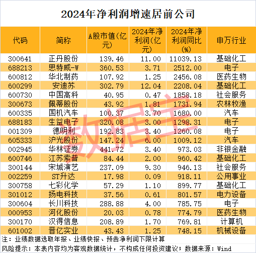 另外三大银行巨头建设银行、中国银行、农业银行分别上涨1.26%、2.39%、1.72%,同步创下历史新高。 除银行板块外,新能源赛道早盘集体发力,固态电池、钠电池、BC电池、锂电池、燃料电池等概念板块出现明显上涨。固态电池概念股华自科技触及20cm涨停,派能科技、先导智能涨超10%,杉杉股份、传艺科技、龙蟠科技触及10cm涨停。 超500家公司2024年业绩翻倍增长 上市公司年报业绩,是洞察行业发展趋势与企业经营状况的一把钥匙,这些数据不仅反映了过去一年企业的经营成果,更是投资者展望未来、制定投资策略的重要依据。 据证券时报·数据宝统计,截至目前,合计超2900家上市公司已披露2024年度业绩数据(含年报、业绩快报和业绩预告),总体上,业绩下滑(含亏损)公司占比过半。部分上市公司受益于行业政策扶持、下游需求驱动,以及公司自身产品创新、成本下降、管理效率提升等因素影响,过去一年经营业绩出现大幅提升。 据数据宝统计,按照年报、业绩快报、预告净利润下限(无下限则取公告数值)计算,2024年净利润翻倍增长(含扭亏为盈)的公司有512家。净利润增速在10倍以上的公司有10家,分别是正丹股份、思特威-W、华北制药、安迪苏、中国高科、佩蒂股份、国机汽车、生益电子、德明利、沪光股份。