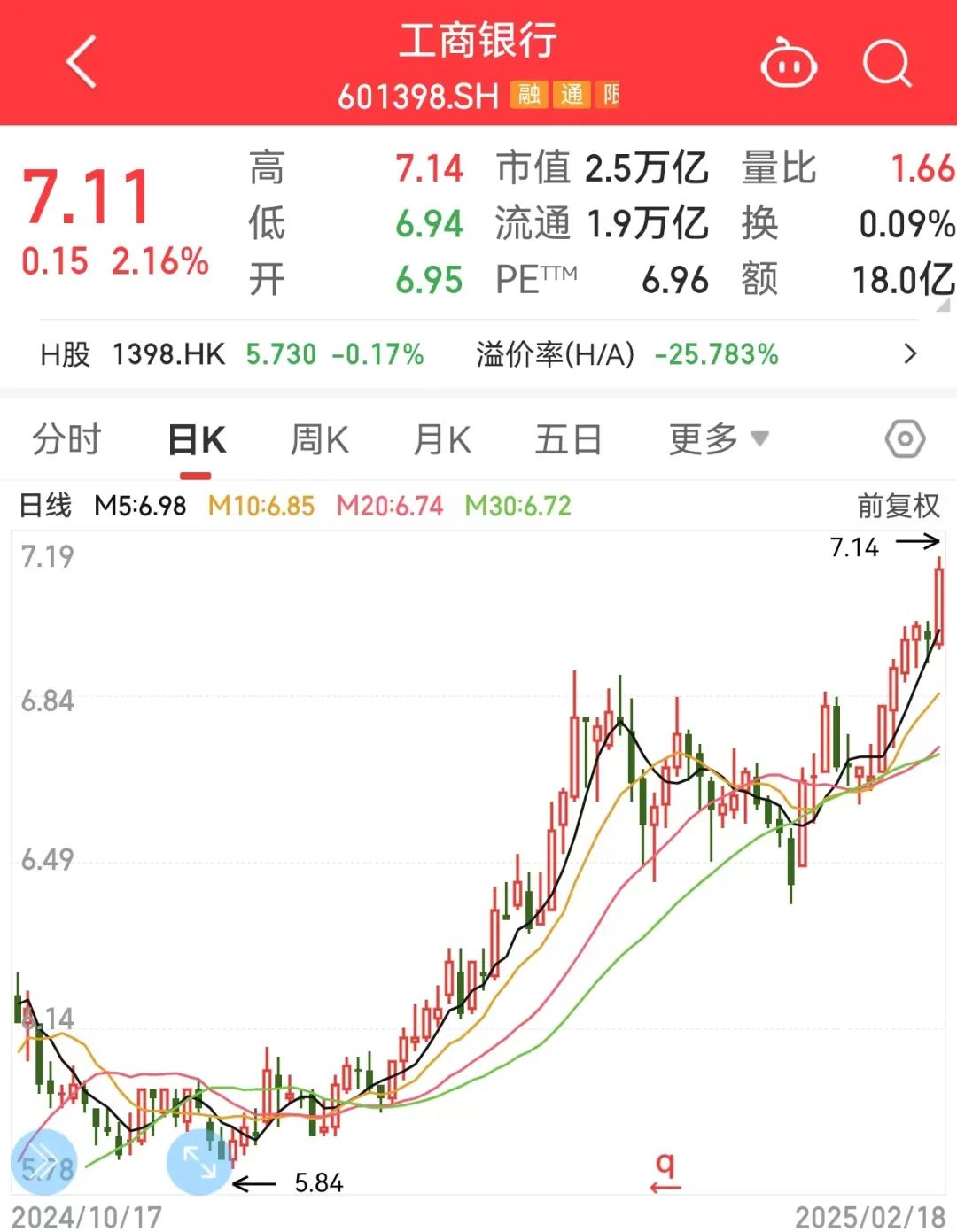 春节后,以DeepSeek为代表的科技板块引领市场修复,产业新逻辑下投资者情绪高涨。 四大行集体创历史新高 2月18日早盘,银行板块大涨。齐鲁银行、青岛银行、青农商行、中信银行、厦门银行涨超2.5%。银行巨头工商银行再次上涨,截至11:30,该股涨幅2.16%,最新股价创历史新高,A股市值突破1.9万亿元,已经坐稳A股市值冠军宝座,逐渐拉开与亚军贵州茅台的差距。