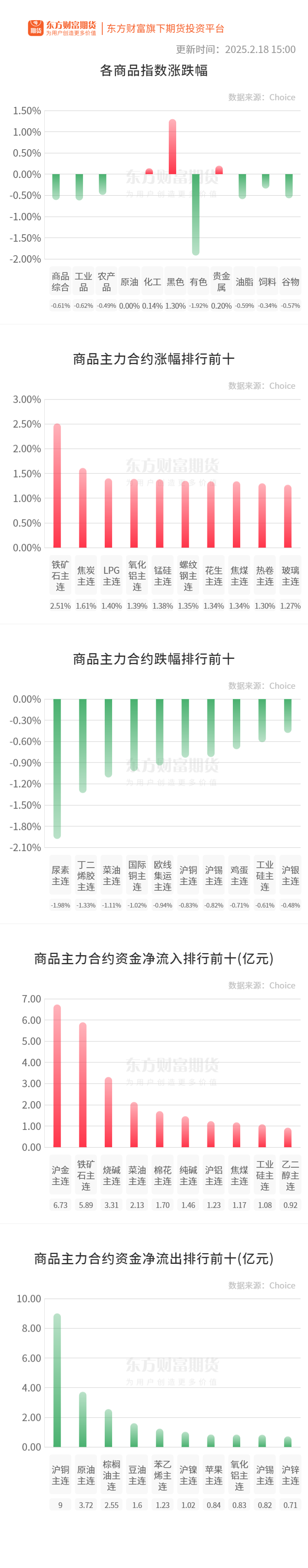 行情纵览![]() 宏观产经财联社:澳洲联储将基准利率下调25个基点至4.10%,为2020年11月以来首次降息,至2023年10月以来新低,符合市场预期。 央视新闻:2月18日,记者从国家发展改革委了解到,我国将进一步破除市场准入的障碍,尽快修订出台新版市场准入负面清单,支持民营企业积极参与“两重两新”,加快促进民营经济发展。 品种资讯黑色系期货 铁矿石:卫星数据显示,2024年2月10日-2月16日期间,澳大利亚、巴西七个主要港口铁矿石库存总量1370.0万吨,环比上升64.7万吨,库存小幅累库,目前库存绝对量处于年初以来的高点。(我的钢铁网) 焦煤:据内蒙古自治区能源局消息,按照《国务院关于煤炭行业化解过剩产能实现脱困发展的意见》(国发〔2016〕7号)等要求,经企业申请,现将内蒙古裕兴矿业有限公司煤矿、准格尔旗西梁煤炭有限责任公司远兴煤矿列入2025年关闭退出计划,现予以公告,接受社会监督。(新华财经) 农产品期货 生猪:重点养殖企业样本数据显示,2025年2月18日重点养殖企业全国生猪日度出栏量为266764头,较昨日上涨9.09%,今日猪价涨幅不及预期,公司出栏先减后增,短期关注二育情绪、集团厂出栏体重变化。(我的钢铁网) 截至2月18日14:00时,全国农产品批发市场猪肉平均价格为21.64元/公斤,较前一日下降0.6%;鸡蛋平均价格为8.49元/公斤,较前一日下降0.6%。(农业农村部) 棕榈油:据船运调查机构SGS公布数据显示,预计马来西亚1月1-15日棕榈油出口量为382116吨,较前一月同期出口的486670吨减少21.48%。(新华财经) 大豆:巴西对外贸易秘书处(Secex)公布的出口数据显示,巴西2月前两周出口大豆1,657,380.81吨(上年2月全月出口量为6,608,137.65吨),日均出口量为165,738.08吨,较上年2月全月的日均出口量减少52%。(新华财经) 有色/贵金属期货 沪金:随着黄金价格屡破新高,华尔街对于黄金的价格预期也愈发乐观。美东时间周一,高盛将其对2025年底黄金价格的预测价格从每盎司2890美元上调至3100美元,理由是全球央行对黄金的需求持续强劲。(财联社) 沪铝:贵州某铝厂1月31日起逐步复产剩余产能,预计3月中下旬全部投运,该企业产能在15万吨/年左右。(上海有色网) 氧化铝:供应端,本周北方部分氧化铝厂传出检修消息,短期或对氧化铝供应量产生小幅影响,本周氧化铝周度开工率小幅下降0.33个百分点;需求端,四川等地部分电解铝减产技改产能或陆续开始复产,对氧化铝的需求有所增加。(上海有色网) 能化期货 烧碱:山东非铝需求一般,2月18日多数品牌报价下调。鲁西南32%离子膜碱主流成交990-1020;鲁中东部32%离子膜碱主流成交950-1010,50%离子膜碱主流成交1600-1680;鲁北地区32%离子膜碱主流成交990-1050;鲁南32%离子膜碱主流成交1000-1020。(单位:元/吨)(隆众资讯) 尿素:2025年2月18日国内尿素行情延续上行,部分地区多数上调20-50元/吨左右。(农时达情报) 原木:节后下游市场复工缓慢,对原木需求承接有限,目前针叶原木库存数据已连续4周累库。截止2月14日,中国7省针叶原木码头和堆场库存总量为349.38立方米,环比上行3.74%,处近5个月来最高水平,其中江苏港累库幅度明显。(隆众资讯) 晚间关注无 (文章来源:东方财富研究中心) |