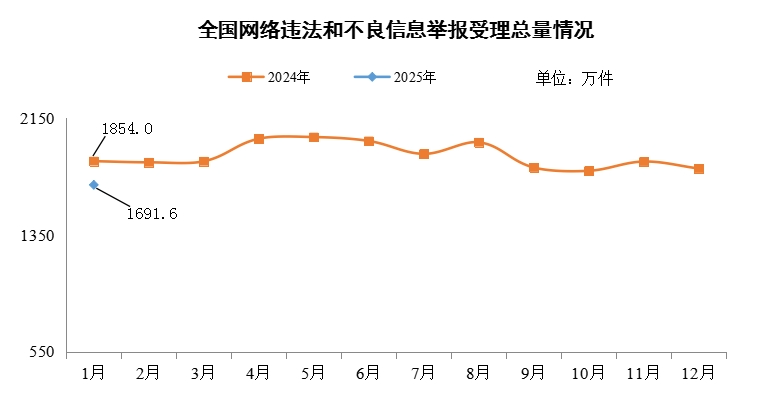 中央网信办举报中心2月17日公布的数据显示,2025年1月,中央网信办举报中心指导全国各级网信举报工作部门、主要网站平台受理网民举报色情、赌博、侵权、谣言等违法和不良信息1691.6万件,环比下降6.2%、同比下降8.8%。