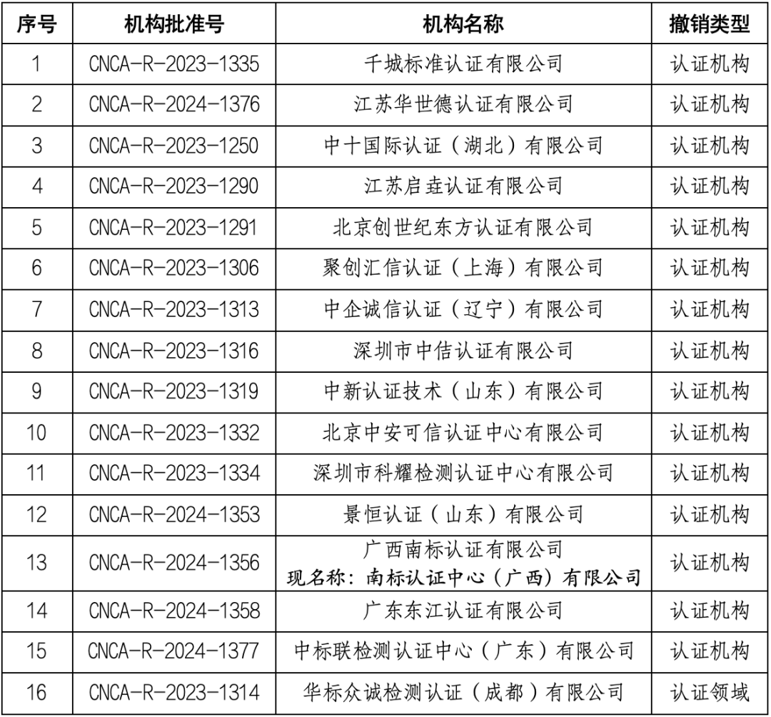依据《中华人民共和国行政许可法》第六十九条、《认证机构管理办法》第三十一条有关规定,决定撤销16家认证机构批准资质和业务领域。