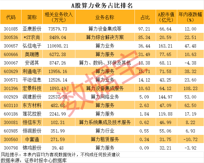 谁是A股算力之王? 对于投资者而言,谁将实质性受益人工智能浪潮,从概念兑现成业绩?卡位AI芯片、拥有较多算力资源,以及数据中心业务较多的公司,有望抢占先机。 从AI芯片来看,寒武纪-U作为国内领先的AI芯片制造商,在算力领域具有强大的技术实力和市场竞争力。其产品广泛应用于云计算、边缘计算等领域,市场需求旺盛。 中科曙光是国内领先的IT解决方案和服务供应商,其高性能计算机产品在国内外市场均享有盛誉。公司在算力基础设施领域有着深厚的积累和丰富的经验。 浪潮信息是国内领先的云计算和大数据服务商,其服务器产品在国内外市场占有率持续领先。公司在算力基础设施领域具备强大的研发和生产能力。 海光信息的主营业务是研发、设计和销售应用于服务器、工作站等计算、存储设备中的高端处理器。公司的产品包括海光通用处理器(CPU)和海光协处理器(DCU)。 另外从算力资源来看,首都在线在10余个国家或地区建设了云网一体化的云计算节点,可为云游戏、AI、XR、数字人、数字孪生、智能制造等各领域提供算力。 弘信电子算力业务的布局主要包括两方面:1.联合算力芯片合作伙伴,进行算力卡及算力服务器等算力硬件设备的研发、生产、销售。2.根据大模型客户及各行各业垂直应用客户需求,开展算力租赁业务。近期公司已与中京电投达成协议,正在紧锣密鼓保障交付落地。 还有公司披露了算力业务情况,侧面反映出公司算力资源。比如润建股份2024年半年度算力网络业务收入2.25亿元,同比增长32.82%。公司持续加大对算力业务的投入,打造国内领先的“算力集群技术服务专家”能力和国内规模领先的智算云服务。 从2024年半年报数据来看,有15家A股公司披露算力业务相关数据。其中,弘信电子算力业务收入超11亿元居首;亚康股份、润建股份等个股收入均超亿元。从占比来看,亚康股份位居第一,算力相关业务收入7.36亿元,占比达97.21%。此外,*ST农尚、弘信电子、奥瑞德等个股算力业务收入占比均超30%。
