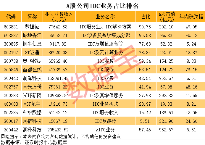 数据中心也是算力能力的重要组成部分。数据宝统计,12家公司2024年公布了IDC业务收入,其中润泽科技和光环新网均超10亿元。从占比来看,数据港、城地香江、铜牛信息、ST证通等个股IDC收入占比均超50%。另外,润泽科技还披露了AIDC(人工智能数据中心)的收入,2024年上半年超过20亿元,占比超57%。润泽科技的IDC业务和AIDC业务合并后占比100%。