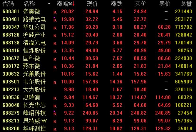 半导体板块强势 半导体板块强势拉升,截至收盘,帝奥微、路维光电20%涨停,华虹公司涨约18%,盘中创出历史新高;韦尔股份亦涨停。