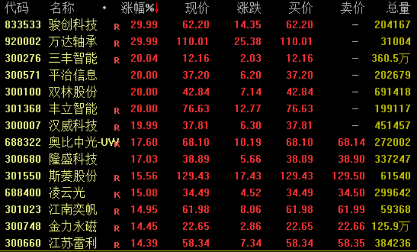 人形机器人概念活跃 人形机器人概念今日再度活跃,截至收盘,骏创科技、万达轴承30%涨停,双双创出历史新高;丰立智能20%涨停,亦创出新高;斯菱股份涨超15%,盘中也创出新高;此外,杭齿前进、四川金顶分别收获6连板和3连板。
