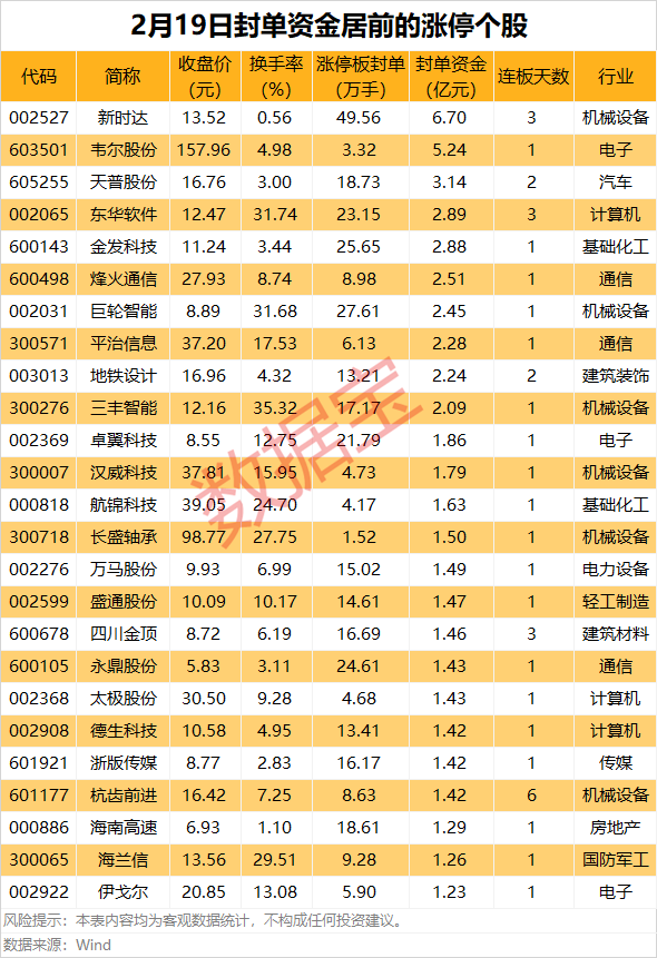 2月19日,A股市场收盘共120股涨停,剔除掉11只ST板块个股后109股涨停;13股封板未遂,整体封板率为90.23%。 涨停战场: 新时达封单量近50万手 据证券时报·数据宝统计,从收盘涨停板封单量来看,新时达封单量最高,有49.56万手;其次是神州高铁、巨轮智能、金发科技,涨停板封单分别为33.41万手、27.61万手、25.65万手。 从连续涨停天数来看,杭齿前进6连板,新时达、东华软件、四川金顶、威尔泰3连板,天普股份、地铁设计等7股2连板;其他还有冀东装备8日5板等。 以封单金额计算,29股封单资金超1亿元,新时达、韦尔股份、天普股份封单资金居前,分别为6.7亿元、5.24亿元、3.14亿元。 新时达具有机器人概念,公司日前在投资者互动平台上表示,目前公司机器人产品主要分为多关节型机器人、众为兴SCARA机器人、半导体机器人等多个品类。据睿工业统计数据,2017年到2019年,新时达旗下子公司众为兴的SCARA机器人出货量处于国产第一,全球第三;2020年到2023年,众为兴的SCARA机器人出货量处于国产第二,全球第四。