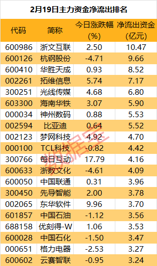 据数据宝统计,21股遭主力资金净流出超3亿元,其中8股主力资金净流出超5亿元。 浙文互联主力资金净流出金额居首,达10.47亿元。杭钢股份主力资金净流出9.66亿元,居次席。 还有华胜天成、拓维信息和光线传媒等市场热门股主力资金净流出居前。