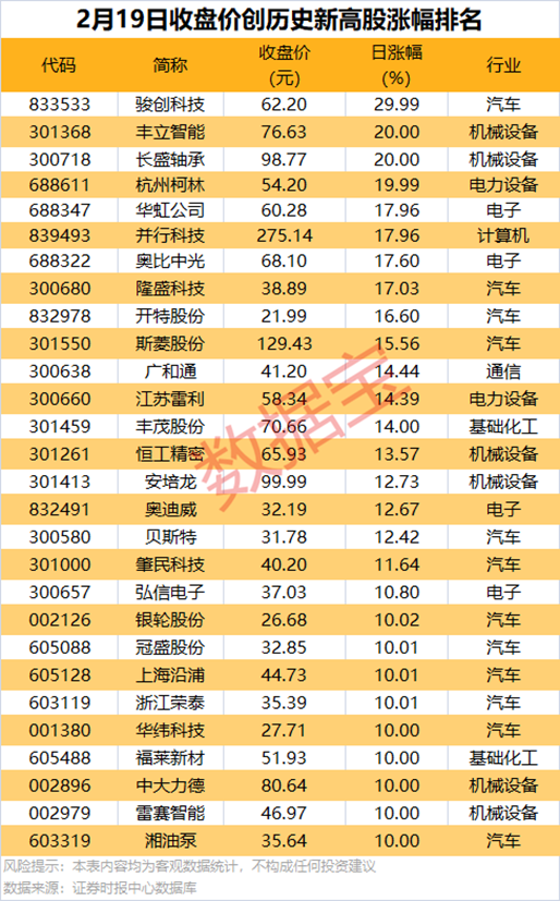 2月19日,市场主要指数集体走强,沪指收盘涨0.81%,科创50、创业板指均涨超2%。A股全天成交额1.75万亿元,较上一日缩量近800亿元。 盘面上,机器人相关概念集体爆发,人形机器人指数涨超8%,居概念板块涨幅之首,PEEK材料、减速器概念均涨超6%;半导体板块也表现强势,帝奥微、路维光电、韦尔股份等涨停。 从个股来看,今日A股呈普涨态势,上涨个股共4645只,其中,收盘股价涨停的有121只。 成交额方面,今日拓维信息、光线传媒、东华软件、每日互动4股成交额超百亿元。 61股收盘创历史新高 不含近一年上市的次新股,今日共有61股收盘价创历史新高。 从行业属性来看,汽车、机械设备、电子行业创新高的个股较为集中,分别有17只、11只、10只个股出现在名单中。 按所属概念看,骏创科技、丰立智能、长盛轴承等多只机器人相关概念股批量创新高。半导体概念今日走势强劲,华虹公司、峰岹科技、思特威等多股创新高。 从股价表现看,收盘创历史新高股中,今日股价平均上涨9.44%,涨停的有骏创科技、长盛轴承、丰立智能等,涨幅居前的有华虹公司、并行科技、奥比中光等。