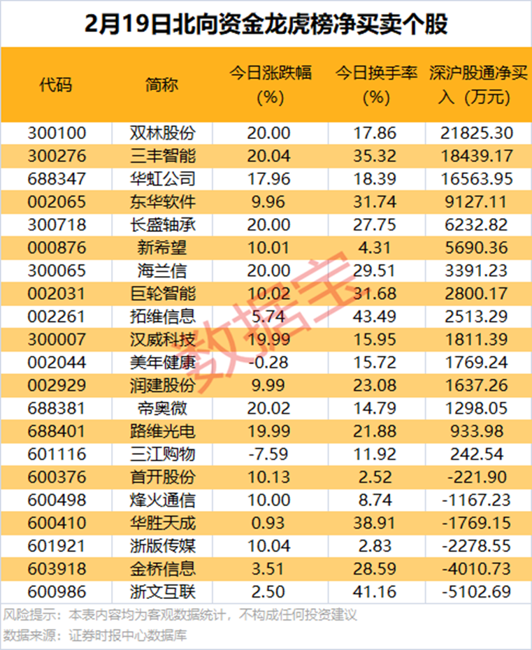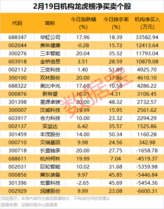 龙虎榜揭秘: 半导体龙头获两类资金共同抢筹 2月19日龙虎榜中,14股获机构净买入,华虹公司、美年健康、三丰智能、金桥信息均获机构净买入超1亿元。 机构净卖出较多的有润建股份、宏景科技、冀东装备等,净卖出金额均超5000万元。