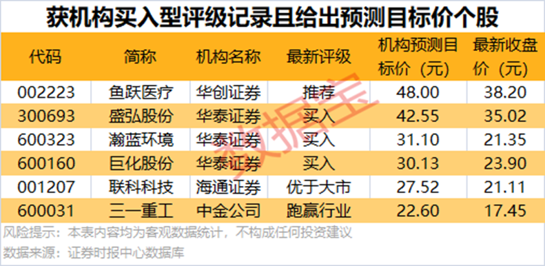 17股今日获机构给予买入型评级 今日机构研报共发布21条买入型评级记录,共涉及17只个股。盛弘股份、巨化股份等关注度最高,均有3次机构买入型评级记录。 获机构买入型评级个股中,共有6条评级记录对相关个股给出了未来目标价。 以公布的预测目标价与最新收盘价进行对比显示,共有6股上涨空间超20%,瀚蓝环境上涨空间最高,2月19日华泰证券预计公司目标价为31.1元/股,上涨空间达45.67%。 此外,上涨空间较高的个股还有联科科技、三一重工等,上涨空间分别为30.36%、29.51%。