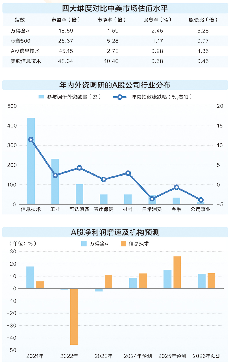 证券时报记者 张娟娟 2022年11月,ChatGPT诞生引发国内科技企业“百模大战”。今年以来,DeepSeek引爆全球科技圈和资本圈,从跟随模仿到创新,中国人工智能技术强势崛起,缩小了中美之间的科技差,展现了中国科技企业强大的创新力,“东方神秘力量”正引领全球资本对中国科技企业乃至中国资产进行价值重估。 如今,以科技公司为代表的中国资产正展现出强大的竞争力和投资性价比。回顾历史,外资齐声唱多中国资产并非罕见。以史为鉴,外资本轮如何行动,以科技公司为代表的中国资产是否被低估,中国资产从“低配”到“超配”有哪些逻辑? 1 中国科技资产迎高光时刻 在一些海外投资者的印象中,中国科技企业缺乏0到1的原创,而擅长于从1到10甚至100的扩展。DeepSeek的出现,一定程度上改变了国际资本对中国科技企业的刻板印象,它以低成本彰显中国0到1的原创实力。 春节后,包括德意志银行、高盛集团、瑞银集团、摩根大通、美国银行等多家外资巨头看多中国市场。德意志银行表示,中国资产正经历“斯普特尼克时刻”,中国企业的估值折价将消失。摩根大通表示,看好中国科技股相对于美国科技股的表现,在近期反弹之后,中国科技股的估值折扣仍然很大。 外资也已经付诸行动。富达投资表示已增加中国股票持仓,并给予超配。高盛集团的数据显示,截至当前,全球对冲基金仍在增持中国资产。国际金融协会(IIF)最新发布的国际资本流动报告也显示,今年1月,外国投资者积极布局中国资产,中国股票和债券吸纳的外资净流入总和超过100亿美元,其中股票吸纳了20亿美元的净流入,为去年9月A股反弹以来最高。 从港股、中概股来看,截至2月18日,最新评级获外资调高的公司均集中于TMT及新能源汽车行业。实际上,受“9·24”新政的影响,外资早在2024年末就加大对中国资产的投资。根据资管机构向美国证监会(SEC)提交的13F报告数据,市值前10的中概股中,仅2只在2024年第四季被机构减仓,阿里巴巴、拼多多、京东、百度等公司均获加仓。 从机构调研数据看,外资明显加大对A股信息技术、消费板块的关注度。截至2月18日,年内信息技术、日常消费、可选消费3个行业获外资调研公司数量占比超五成,其中信息技术公司数量占比超过32%;去年同期,上述3个行业获外资调研公司数量占比45%,信息技术公司数量占比低于30%。 从调研的机构数量来看,2025年以来,参与对信息技术公司调研的外资机构数量占比首次超过45%,为近5年同期最高。过去4年外资关注度最高的是工业、公用事业、医疗保健行业。 行情表现方面,信息技术板块今年以来表现最好,截至2月18日,年内表现最优异的便是与TMT相关的通讯服务、信息技术板块。 2 四大维度对比中美市场估值 在外资看来,中国资产最大吸引力来自于较低的估值水平。 从市盈率看,上证指数最新滚动市盈率(PE)在14倍左右,与过去10年平均PE基本持平;美国标普500指数当前PE为28倍左右,较过去10年平均PE溢价15%左右。A股信息技术指数(证监会行业分类,下同)当前PE在45倍左右,美股信息技术板块PE在48倍左右,两者估值水平接近。 但是,从历史来看,美股信息技术板块PE已逼近过去10年最高水平,A股信息技术板块远低于过去10年最高水平;恒生指数、恒生科技指数的当前PE均低于过去10年平均值。 市净率方面,万得全A指数最新市净率1.6倍左右,美股标普500指数市净率比前者多2倍;A股信息技术指数市净率低于3倍,美股信息技术指数市净率超过10倍。 从股息率来看,万得全A指数股息率达到2.45%,标普500指数不足前者的一半;A股信息技术指数股息率0.98%,美股信息技术指数股息率低于0.6%。 股债比价(市盈率倒数/国债收益率)将股票与债券两类资产结合,用于判断当前股票相对债券性价比高低,比值越高,投资股票性价比越高。数据宝分别以指数滚动市盈率与年内10年期国债(中、美国债)平均收益率进行估算,万得全A的股债比价超过3倍,标普500股债比价0.8倍左右;A股信息技术板块股债比价超过1.35倍,美股信息技术低于0.5倍。 综上来看,相较于美股,A股估值更低,投资性价比更高。从纵向看,过去5年(2020年至2024年),中/美估值差距逐渐放大,A股市净率呈下降趋势,股债比价、股息率逐年攀升;美股在经历长期上涨后,标普500最新股债比价仅为过去5年均值的60%左右。 华泰证券研究所所长、首席固收研究员张继强在接受证券时报记者采访时表示,目前美股等估值已经偏高,全球资金正在寻找高性价比资产,估值处于相对洼地的中国资产此时再度回归投资者视野。 中信证券认为,DeepSeek带来的重估,表面上看是提高了龙头公司PE估值倍数,深层看,是中国AI资产从负估值向正估值的转变。未来,如果出现经济预期好转,主业估值倍数有提升空间;AI业务一旦实现显著的收入贡献,亦有望出现市销率分部估值的转变。中信证券判断,拉长历史周期看,目前仍处于AI时代的早期,以及中国科技资产重估的开端,未来每一次大的技术突破和应用落地,都有机会带来系统性的估值提升。 3 重估中国资产的逻辑 高盛集团、德意志银行、贝莱德、美国银行等外资机构看好中国资产的价值重估。贝莱德表示,经过数年的转型反弹期,中国经济有望在新质生产力,特别是高科技制造领域取得初步成果,且经济增速回升至良性循环。 为何中外机构集体看多中国资产,中国资产被重估的原因是什么?笔者认为主要有