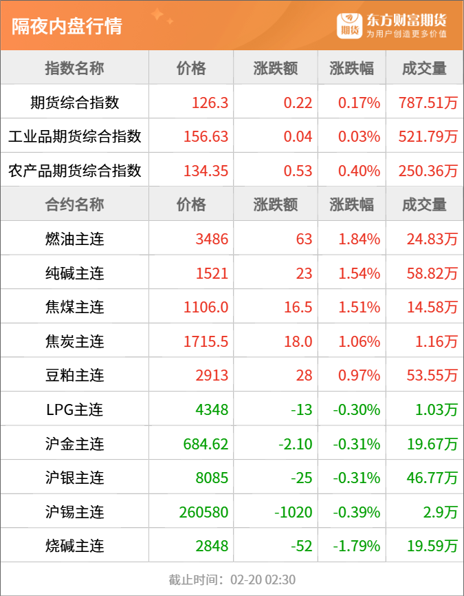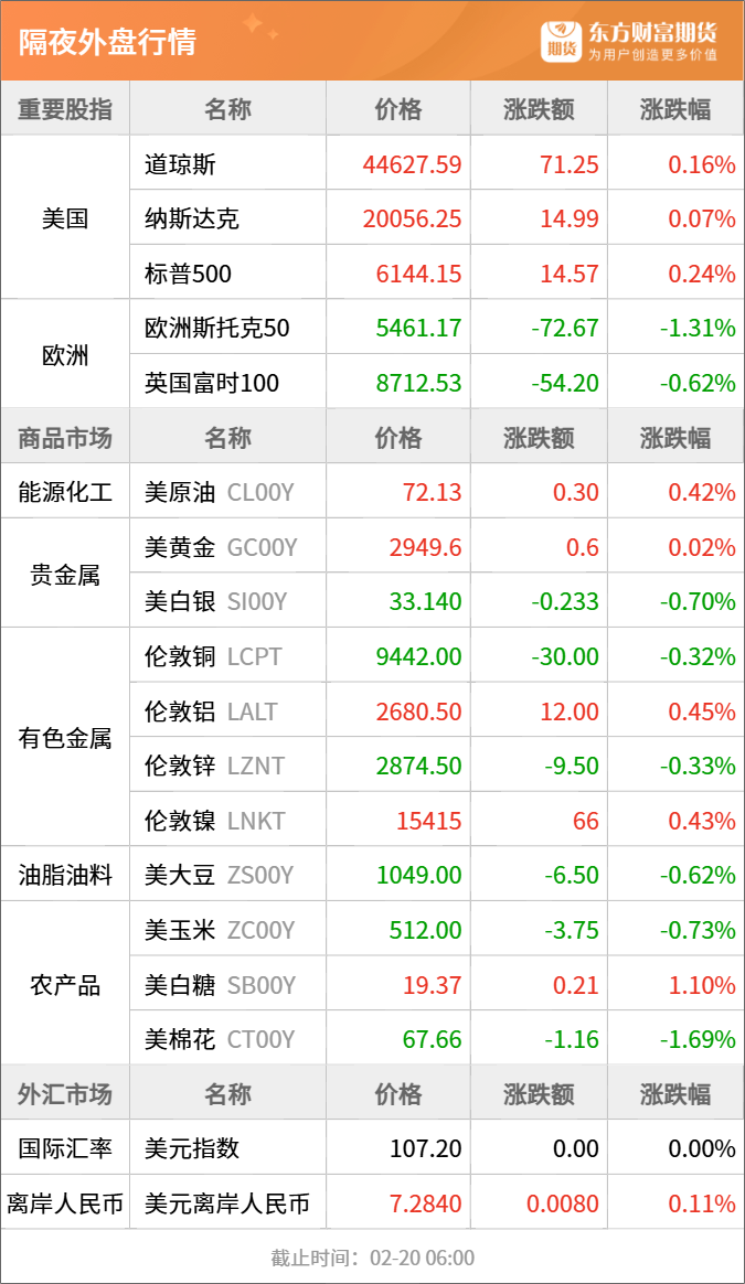 隔夜行情![]() ![]() 每日精选特朗普:将于下个月或更早宣布对汽车、半导体、芯片等商品的关税 美联储公布1月会议纪要:通胀率略高 经济前景不确定 关税威胁引发避险需求 现货黄金再创历史新高 宏观产经界面新闻:2月19日消息,国务院办公厅发布关于转发商务部、国家发展改革委《2025年稳外资行动方案》的通知。其中提出,鼓励外资在华开展股权投资。抓好《外国投资者对上市公司战略投资管理办法》落实,制定发布实施战略投资的操作指引,加大对上市公司、境外基金和投资机构等的宣介力度,引导更多优质外资长期投资我国上市公司。 市场监管总局:市场监管总局等五部门印发《优化消费环境三年行动方案(2025—2027年)》,到2027年,消费供给提质、消费秩序优化、消费维权提效、消费环境共治、消费环境引领等五大行动深入开展,供给质量不高、市场秩序失范、维权效能不足等问题得到系统治理,商品、服务质量显著提高,消费风险明显降低,消费纠纷源头治理效果显著,经营者诚信意识普遍增强,消费便利度、舒适度、满意度大幅提升,全国消费环境明显优化。 国家统计局:2025年1月份,70个大中城市中,一线城市商品住宅销售价格环比继续上涨,二三线城市环比总体略降;一二三线城市同比降幅均持续收窄。 品种资讯黑色系期货 铁矿石:据统计,2月19日全国主港铁矿累计成交74.3万吨,环比上涨0.54%;本月平均每日成交84.0万吨,环比下跌3.11%。当天远期现货累计成交46.5万吨(4笔),环比上涨20.78%,其中矿山成交量为17万吨。(新华财经) 截至2月18日,2025年澳洲铁矿石发运总量为10497万吨,同比减少563万吨。巴西铁矿石总发运量同比2024年仅减少162万吨。倘若未来南半球的天气状况好转,不再对发运造成较大干扰,那么2025年第一季度的总发运量极有希望恢复至往年的平均水平。(上海有色网) 钢材:鞍山宝得厂家因炉子生产不顺,于2月19日高炉以及型钢轧线开始检修停产,预计停产检修40天左右,预计影响型钢产量22万吨左右,目前厂家库存压力不大,正常销售中,市场商贸近日来陆续有所补库,预计短期内,厂家价格坚挺运行,东北型钢市场商贸价格多跟随厂家价格调动运行。(我的钢铁网) 锰硅:锰矿市场价格小幅反弹,矿商报价上调,天津港半碳酸38-38.5元/吨度,报价40元/吨度左右,加蓬48-48.5元/吨度,澳块48.5-49元/吨度,氧化矿主流报价50元/吨度左右。钦州港锰矿成交价格跟随盘面价格小幅上行,下游按需少量补库,半碳酸价格38-39元/吨度,澳籽45-47元/吨度,加蓬块48-49元/吨度。(我的钢铁网) 农产品期货 生猪:近两日受二育入场支撑,加上养殖端有缩量拉涨意愿,供应压力缓解,支撑猪价短时表现偏强。不过需求淡季,消费缺乏有效支撑,供强需弱状态持续,屠企压价收猪意愿不变,养殖端对后市信心不足,叠加仔猪价格持续回调,后期二育入场积极性或将减弱,价格或回归弱势。(中国饲料行业信息网) 豆粕:据统计,2月19日全国主要油厂豆粕成交12.24万吨,较前一交易日增加2.24万吨,其中现货成交9.84万吨,较前一交易日增5.09万吨。当日全国动态全样本油厂开机率为62.2%,较前一日增0.98个百分点。(新华财经) 棕榈油:据船货调查机构Intertek,印度尼西亚1月棕榈油出口152.5万吨,环比减少20%。(财联社) 玉米:据调研,本周(2025年2月13日至19日)全国玉米加工总量为64.69万吨,较上周增加3.98万吨;周度全国玉米淀粉产量为32.28万吨,较上周产量增加2.61万吨;周度开机率为62.4%,较上周升高5.05%。(新华财经) 有色/贵金属期货 沪铜:花旗集团最新报告认为,未来三个月铜价将下跌约10%,4月初之后铜价将回落至每吨8500美元,届时美国进口关税的实施将开始影响现货市场。该行分析师将0-3个月的目标价设在8,500美元,但表示铜价可以维持在当前水平附近直到4月。(界面新闻) 多晶硅:硅业分会消息,本周多晶硅价格持稳,n型复投料成交价格区间为3.90-4.60万元/吨,成交均价为4.17万元/吨。价格方面,本周多晶硅企业涨价呼声有所减弱,受下游产品价格松动预期影响,多晶硅企业现阶段以稳价为主。(财联社) 碳酸锂:2025年2月19日,雅保公司于Metalshub平台成功拍卖200吨由永杉锂业代工的电池级碳酸锂,拍卖采用自主报价形式。此次拍卖的最终成交价格为75932元/吨。拍卖所涉及的电池级碳酸锂原料源自澳大利亚格林布什锂矿。(我的钢铁网) 能化期货 原油:巴西矿业和能源部长亚历山大·西尔韦拉18日宣布,巴西加入由石油输出国组织(欧佩克)成员国和非欧佩克产油国组成的“欧佩克+”。(新华网) 19日,记者从中国海油天津分公司获悉,位于渤海海域的秦皇岛33-1油田通过实施地下地面高效协同开发,日产原油突破210吨,创下历史新高。(新华社) 甲醇:常州地区甲醇进口货源暂无报价,价格参考评估2600-2610元/吨附近出库;张家港地区可售量几无;靖江地区报盘价格参考2600-2610元/吨附近。(隆众资讯) 沥青:截至2月19日当周,基于当前原材料成本计算,沥青生产的综合利润周度平均值降至-563.5元/吨,较前一周微降2.9元/吨。周内原材料及沥青价格均有所上升,整体利润空间小幅收缩。同期,由于齐鲁石化和福建联合的生产线转产,尽管东明石化复产沥青,国内沥青装置的检修量仍然降至85.3万吨,较前一周减少3.5万吨,降幅为3.9%。(隆众资讯) 环球视野财联社:英国1月CPI同比增长3%,预期增长2.8%;1月CPI环比下降0.1%,预期下降0.3%。 财联社:新西兰联储将基准