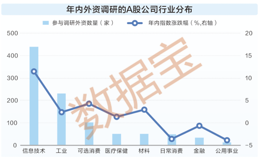从机构调研数据看,外资明显加大对A股信息技术、消费板块的关注度。截至2月18日,年内信息技术、日常消费、可选消费3个行业获外资调研公司数量占比超五成,其中信息技术公司数量占比超过32%;去年同期,上述3个行业获外资调研公司数量占比45%,信息技术公司数量占比低于30%。