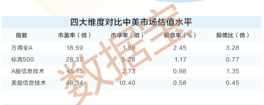 从调研的机构数量来看,2025年以来,参与对信息技术公司调研的外资机构数量占比首次超过45%,为近5年同期最高。过去4年外资关注度最高的是工业、公用事业、医疗保健行业。 行情表现方面,信息技术板块今年以来表现最好,截至2月18日,年内表现最优异的便是与TMT相关的通讯服务、信息技术板块。 四大维度对比中美市场估值 在外资看来,中国资产最大吸引力来自于较低的估值水平。 从市盈率看,上证指数最新滚动市盈率(PE)在14倍左右,与过去10年平均PE基本持平;美国标普500指数当前PE为28倍左右,较过去10年平均PE溢价15%左右。A股信息技术指数(证监会行业分类,下同)当前PE在45倍左右,美股信息技术板块PE在48倍左右,两者估值水平接近。 但是,从历史来看,美股信息技术板块PE已逼近过去10年最高水平,A股信息技术板块远低于过去10年最高水平;恒生指数、恒生科技指数的当前PE均低于过去10年平均值。 市净率方面,万得全A指数最新市净率1.6倍左右,美股标普500指数市净率超过前者的2倍;A股信息技术指数市净率低于3倍,美股信息技术指数市净率超过10倍。 从股息率来看,万得全A指数股息率达到2.45%,标普500指数不足前者的一半;A股信息技术指数股息率0.98%,美股信息技术指数股息率低于0.6%。 股债比价(市盈率倒数/国债收益率)将股票与债券两类资产结合,用于判断当前股票相对债券性价比高低,比值越高,投资股票性价比越高。数据宝分别以指数滚动市盈率与年内10年期国债(中、美国债)平均收益率进行估算,万得全A的股债比价超过3倍,标普500股债比价0.8倍左右;A股信息技术板块股债比价1.35倍,美股信息技术低于0.5倍。 综上来看,相较于美股,A股估值更低,投资性价比更高。从纵向看,过去5年(2020年至2024 年),中/美估值差距逐渐放大,A股市净率呈下降趋势,股债比价、股息率逐年攀升;美股在经历长期上涨后,标普500最新股债比价仅为过去5年均值的60%左右。