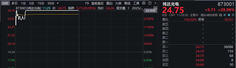 AI眼镜或进爆发期 消费电子产业早间全线走强,AI眼镜方向领涨,板块指数高开高走,盘中放量大涨逾5%,创历史新高,半日成交超昨日全天成交。 纬达光电开盘后仅约1分钟就30%涨停,杰美特、星星科技则均秒速20cm封板,明月镜片、博士眼镜、雷柏科技等近20股也强势涨停或涨超10%。