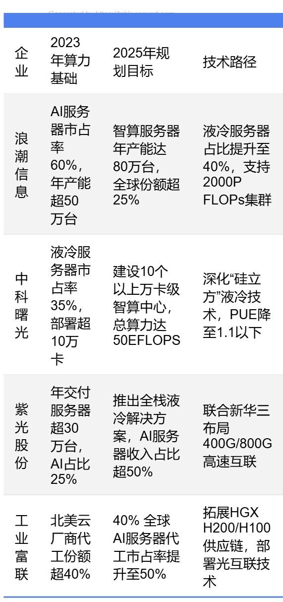 小型云计算厂商则更多受益于“科技平权”,青云科技(688316.SH)、优刻得(688158.SH)今年以来涨幅分别高达178.1%和183.1%,小型云计算厂商没有自研大模型的能力,DeepSeek的出现快速拉近开源大模型和闭源大模型的差距,也就变相拉近了只能部署开源大模型的小型云计算厂商和拥有闭源大模型的大型云计算厂商之间的差距。 服务器行业确定性高 DeepSeek爆火最直接受益的第二个方向就是服务器领域。一方面,DeepSeek的高性能模型对服务器算力提出了更高要求,推动了服务器硬件的升级和迭代。另一方面,DeepSeek的开源策略吸引了大量用户流量,这些流量需要由服务器来承载和处理。服务器厂商可以抓住这一机遇,来应对DeepSeek带来的日益增长流量需求。 A股服务器等相关企业能否迎来价值重估,取决于公司现有算力及未来规划算力这两项数据,算力规模即代表了企业未来营收可能到达的天花板及可能性,同时也是公司价值的体现。各大服务器厂商中,目前浪潮信息(000977.SZ)在AI服务器领域处于龙头地位,从未来规划目标来看,浪潮信息有望保持国内AI服务器市场的领先地位。