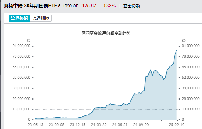 投资者意见分歧大 在债市接连调整的情况下,部分债券ETF的规模发生变化。 记者观察发现,鹏扬中债—30年期国债ETF、博时上证30年期国债ETF等债券ETF的规模保持增长,投资者在债市调整的过程中逆势加仓,但海富通中证短融ETF等债券ETF的规模出现缩水。 具体来看,鹏扬中债—30年期国债ETF的最新规模达到108.13亿元,投资者在债券市场调整的过程中逆势加仓,使该债券ETF的规模保持增长态势。Wind数据显示,截至2月19日,鹏扬中债—30年期国债ETF流通的份额为8603.81万份,相比2月14日增加了522万份。 不过,2月19日当天,鹏扬中债—30年期国债ETF流通的份额较2月18日减少了31万份。