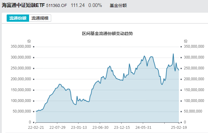 不过,2月19日当天,博时上证30年期国债ETF的流通份额也有所减少,当天的流通份额较2月18日减少了15.40万份。 海富通中证短融ETF的流通份额近期下降比较明显。Wind数据显示,海富通中证短融ETF今年年初的规模约为300.07亿元,2月19日的规模降至268.04亿元。短端债券市场的接连调整以及流通份额减少或是该债券ETF规模下降的主要原因。海富通中证短融ETF最新流通份额为2.41亿份,相比1月27日的份额减少了3563.20万份。