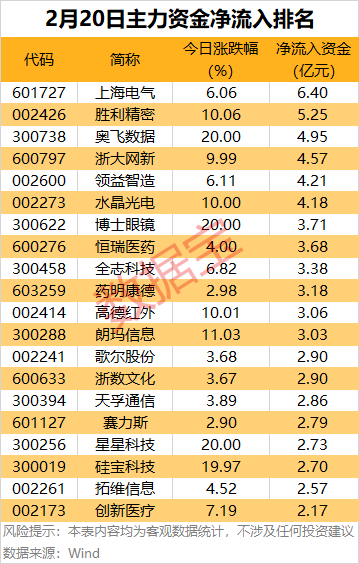 医药生物行业主力资金净流入金额远超其他行业。 2月20日,A股三大指数震荡整理,沪深两市成交额达1.79万亿元,较昨日小幅放量超400亿元。个股方面,上涨股票数量接近3400只,逾百股涨停,AI眼镜概念股掀涨停潮。 从今日的主力资金情况来看,沪深两市全天净流出326.92亿元。6个行业呈现主力资金净流入,其中医药生物主力资金净流入17.24亿元,远超其他行业;国防军工、商贸零售、钢铁行业分别获净流入6.22亿元、3.78亿元、3.54亿元。 25个净流出行业中,计算机行业主力资金净流出金额居首,为101.08亿元;机械设备、电力设备2个行业分别遭主力资金出逃50.33亿元、40.41亿元;传媒、通信、汽车行业主力资金净流出均超20亿元。 12股获主力资金抢筹超3亿元 据数据宝统计,沪深两市81股主力资金净流入超1亿元,其中12股获主力资金抢筹超3亿元。 上海电气主力资金净流入6.4亿元,居首。消息面上,上海电气控股子公司电气风电筹划与韩国晓星集团在韩国建立风电机组装配合资工厂,目前该项目处于合资谈判阶段,预计最快两年后会具备生产能力。 胜利精密主力资金净流入5.25亿元,居次席。消息面上 ,胜利精密2月19日在互动平台回答投资者提问时表示,目前没有和宇树科技开展业务合作,复合集流体项目仍处研发、试产、送样阶段。