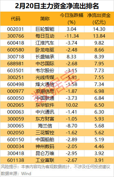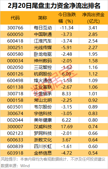 净流出方面,每日互动尾盘主力资金净流出超3亿元,居首。中国联通、江淮汽车、光线传媒尾盘主力资金净流出均超2亿元。