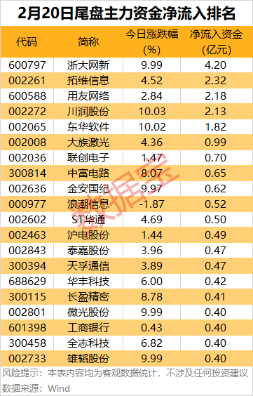 尾盘5股获主力抢筹超1亿元 据数据宝统计,尾盘沪深两市主力资金净流出18.24亿元,其中创业板尾盘净流出6.12亿元,沪深300尾盘净流出2.57亿元。 行业方面,计算机、国防军工尾盘获净流入均超2亿元;汽车、传媒行业尾盘主力资金净流出均超4亿元。 个股方面,浙大网新、拓维信息、用友网络、川润股份、东华软件尾盘均获主力资金抢筹超1亿元。 浙大网新今日涨停,公司是以浙江大学综合应用学科为依托的信息技术咨询和服务集团,涉及算力概念。