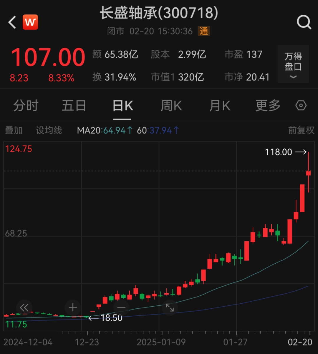 2025年,医药投资格局将因AI医疗的崛起与产业的跟进而改变。 2月20日,沪指全天窄幅震荡,创业板指探底回升。AI眼镜集体爆发,机器人概念股持续活跃,有机硅、AI医疗等板块涨幅居前;保险、船舶、游戏、腾讯云等板块跌幅居前。 宇树机器人概念人气股长盛轴承今日午后一度涨超17%,股价再创历史新高,最高点至118元/股。相比2024年2月6日盘中最低价10.84元/股,区间股价涨超10倍。不过值得关注的是,长盛轴承尾盘出现筹码松动情况,较日内高点回落超10%,最终收涨8.33%。 2月18日晚间,市场流传出一张长盛轴承董事会秘书何寅在微信朋友圈庆贺公司股价大涨的截图,配文称“88.88,新里程碑。感谢市场认可,感谢投资者抬爱”。 对此,长盛轴承相关人士回应称,对于网传董秘发圈庆祝一事并不清楚,关于股价的相关事项,可以查阅公司近期发布的异动公告。 根据公司近日披露的异动公告显示,公司的主营业务为自润滑轴承及高性能聚合物的研发、生产及销售,主要产品为自润滑轴承、低摩擦副零部件及相关的精密铸件。公司主营业务保持平稳,未出现大幅度波动。公司在机器人零部件领域的业务处于小批量的生产销售阶段,在公司主营业务收入中占比低(不足1%),不会对公司业绩产生重大影响。敬请广大投资者理性投资,注意风险。