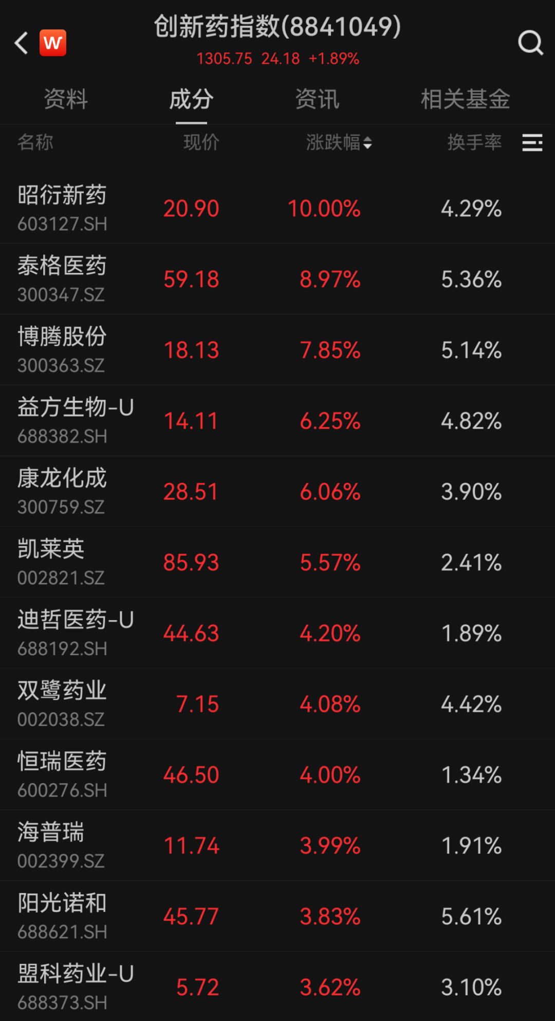 创新药板块走高 今日午后,A股、港股创新药板块走高,其中CRO概念领涨。截至收盘,CRO概念指数上涨4.21%,位居A股概念涨幅榜第二。昭衍新药上涨10%,全天成交额突破5.4亿元,换手率4.29%,市场交投活跃度显著提升。
