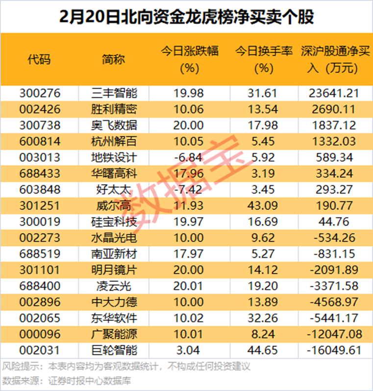 北向资金今日现身17股龙虎榜,三丰智能、胜利精密、奥飞数据获北向资金净买入金额居前。 北向资金净卖出金额较多的有巨轮智能、广聚能源、东华软件等。