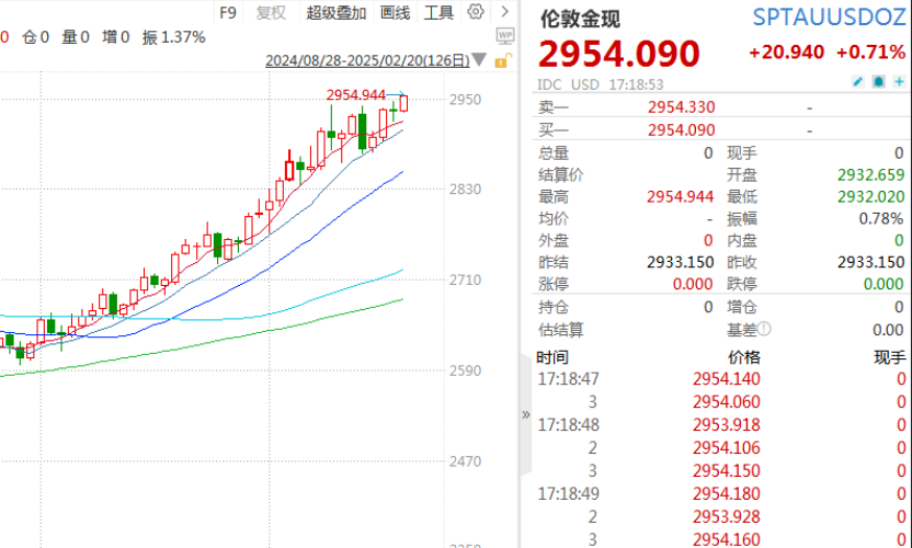 国际金价再创新高 今日,金价再次走高。Wind数据显示,伦敦金现盘中首次突破2950美元/盎司,再创历史新高。