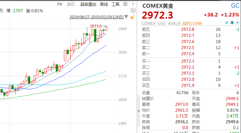 COMEX黄金最高上涨至2973美元/盎司,逼近3000美元/盎司关口,同样刷新历史纪录。