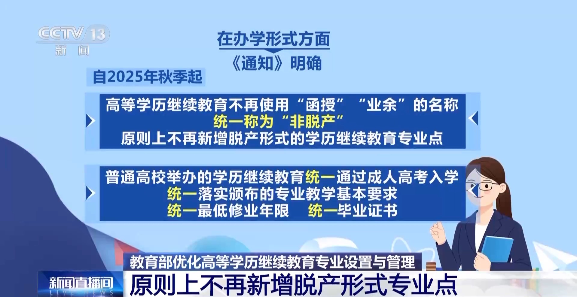 在办学形式方面,《通知》明确,自2025年秋季起,高等学历继续教育不再使用“函授”“业余”的名称,统一称为“非脱产”,原则上不再新增脱产形式的学历继续教育专业点;普通高校举办的学历继续教育统一通过成人高考入学,统一落实颁布的专业教学基本要求,统一最低修业年限,统一毕业证书。2025年秋季学期前已注册入学的函授、业余、网络教育学生继续按原政策执行。 责编:刘茜 一审:印奕帆 二审:蒋俊 三审:谭登 来源:央视新闻客户端 |