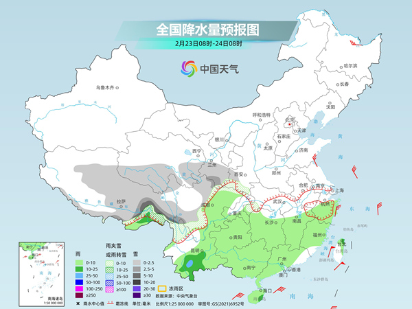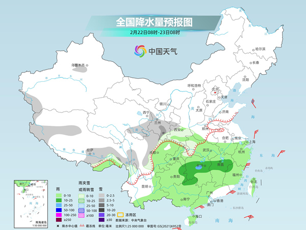 央视网消息:据中国天气网,未来三天(2月21日至23日),南方阴雨天气较多,西南、江南等地有小到中雨,局地大雨。同时,西藏东南部雨雪频繁,部分地区有大雪,需注意防范。受冷空气和雨雪影响,我国大部地区气温将陆续降至近期低点,江南等地天气湿冷,公众请注意保暖。 南方阴雨持续局地有大雨 北方雨雪日渐缩减 昨天,南方大部被阴雨覆盖,北方的雨雪天气主要出现在西北地区东部、华北南部等地。监测显示,甘肃东部、宁夏南部、陕西中部、山西中部和南部、河南中北部及西藏中部等地出现小到中雪或雨夹雪天气,陕西宝鸡局地大雪;湖南中南部、江西大部、安徽南部、浙江大部、福建西部和北部、广西东北部、台湾北部等地出现中到大雨,浙江衢州、台湾台北局地暴雨。 未来三天,西南、江南等地仍多降雨,北方雨雪逐日缩减,仅在西北部分地区有中到大雪。同时,西藏东南部等地雨雪频繁,部分地区有大雪。 具体来看,中央气象台预计,今天,新疆沿天山地区、西藏北部和东部、青海中东部、甘肃南部、山西东部、山东北部、湖北西部、川西高原东部等地部分地区有小雪或雨夹雪,其中,西藏东部、甘肃南部等地部分地区有中到大雪。西藏东南部、江汉大部、江南中北部和西部、西南地区东部和南部、广西西部和北部、海南岛等地部分地区有小雨,其中,湖南北部和西部、云南南部等地部分地区有中雨。
