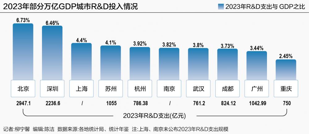 北京、深圳领先 研发投入强度是衡量一个地区或国家科技创新能力的重要指标之一,它反映了科技创新投入的规模和水平。 21世纪经济报道梳理发现,根据已公布的最新数据,2023年我国GDP排名前十的城市中,北京、深圳研发投入强度遥遥领先,均超过6%,上海、苏州也超过4%,随后是杭州、南京、武汉、成都、广州均超过3%,重庆为2.45%。 一般而言,研发投入强度达到3%,就意味着达到了创新型国家和地区中等水平,通常被认为已进入创新驱动发展阶段。 2023年,北京R&D经费投入2947.1亿元,比上年增加103.7亿元,增长3.7%,R&D经费投入强度为6.73%,保持较高水平。从结构看,企业、政府属研究机构、高等学校经费所占比重分别为46.6%、37.9%和12.4%。 2023年,深圳R&D经费投入2236.61亿元,增长18.9%,首次实现总量和强度居全国城市“双第二”。其中,深圳企业R&D经费投入总量居全国城市第一。深圳2023年R&D经费投入强度为6.46%,也是首次突破6%,比上年提高0.65个百分点,连续9年提升。 值得注意的是,深圳在科技创新和产业发展中的独特模式是“6个90%”的经验做法,也就是90%以上的创新型企业是本土企业,90%以上的研发机构、研发人员、研发资金、职务发明专利、重大科技项目发明专利集中在企业,其核心是以企业为主体、市场为导向、产学研深度融合。 杭州也在向深圳学习相关的科创经验。 根据2024年11月18日杭州市科学技术局在官网发布的消息,2024年11月14日,时任杭州市人民政府副市长胥伟华带队参加第二十六届中国国际高新技术成果交易会开幕式,当天下午还带队赴深圳市大疆创新科技有限公司调研。该文章提到,“‘创新’是深圳发展之魂,是深圳加快形成新质生产力的核心驱动力。近年来,深圳充分发挥完善的产业体系和强大的科技创新能力相结合的显著优势,推动创新链产业链资金链人才链深度融合,值得杭州关注和学习。” 杭州师范大学经济学院副教授樊文静在接受21世纪经济报道记者采访时表示,与北京、上海等城市相比,杭州在科创资源方面仍存在一些短板和不足,首先是高端人才集聚的差距。尽管杭州拥有阿里巴巴、浙江大学等顶尖企业和高校,但在国际顶尖科学家和高端人才的引进和培养方面,仍需进一步加强。 其次是核心技术的突破能力。杭州在人工智能领域的核心技术研发能力仍有提升空间。虽然杭州已建立了多个国家或地区级创新平台,但在核心算法、大模型等关键技术的基础理论突破上,与北京、上海等城市相比仍有差距。 最后是产业生态的国际化程度。樊文静表示,杭州的产业生态虽然在国内具有较强的竞争力,但在国际市场的影响力和竞争力方面,仍需进一步提升。相比而言,北京和上海在人工智能领域的国际影响力和应用场景的多样性上更为突出。 杭州的创新优势和短板 近期,“杭州六小龙”的爆火让更多的目光关注杭州科创。 21世纪经济报道梳理2019—2023年杭州全社会R&D投入情况发现,这五年来,杭州的R&D经费投入稳步增长,特别是2021年比上年同比增长15.2%,规模达到666.99亿元。 2023年,杭州R&D投入规模达到786.38亿元,仍低于北京(2947.1亿元)、深圳(2236.6亿元)、苏州(1055亿元)、广州(1042.99亿元)、成都(824.12亿元)等城市。 从主要执行部门R&D经费投入看,2019—2023年杭州的规上工业企业R&D支出占比反而呈下降趋势,研究机构和高等院校相关数据的占比却在提升。 杭州的创新紧迫感十分明显。2025年,杭州新春第一会上提出大兴科技、大抓创新、大力发展新质生产力,将举全市之力打造更高水平“创新活力之城”,全社会研发投入强度力争突破4%。 不过,科创毕竟不是完全资本驱动的,这也是“杭州六小龙”引发关注的原因之一——在研发投入并非最强的杭州,跑出几个前沿领域的头部科创公司,并处在国际竞争前列,让人们重新思考创新的“关键配方”。 一个世纪以来,硅谷模式是最受关注的创新生态系统,有观点认为,“产学研”合作和空间结构是其科创萌发的土壤。 在介绍硅谷成功秘诀的《硅谷之谜》一书中,作者吴军剖析了气候说、斯坦福之说、风险投资说、政府扶持说、知识产权保护说等几种原因,最终归于硅谷宽容叛逆、多元文化、宽容失败、追求卓越拒绝平庸的特质,跳出过去工业时代对企业成功的思维方式。 硅谷了不起的地方在于其孕育了很多伟大的公司,从最早的仙童、英特尔,到后来的谷歌和特斯拉。 硅谷无法完全复制,但其经验值得借鉴。 类比硅谷,在信息时代,因为几家科技公司而出名,杭州似乎也有萌生创新型区域的潜力。但需要注意的是,我国城市的独特挑战还在于平衡好政府助推和市场自发的关系,培养风险容忍文化,避免让创新成为“唯GDP论”下的创新泡沫。 今年,杭州财政资金继续加大对创新的投入,落实“三个15%”的科技财政政策,即市财政科技投入年均增长要达到15%以上,市本级每年新增财力的15%以上要用于科技投入,同时统筹现有产业政策资金当中的15%集中投向培育发展新质生产力。 相比于可遇不可求的原始创新,杭州政府更注重的是打造“科技成果转移转化首选地”品牌,让更多科技成果在杭交易、在杭转化、在杭应用。 根据浙江省科技信息研究院发布《2024浙江科技成果转化指数》,杭州以473.93指数值继续稳居榜首,高于第二位嘉兴199.07,遥遥领先。 今年,杭州特色科技成果转移转化体系也将进一步迭代升级,