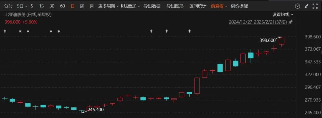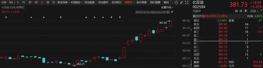 消息面上,阿里巴巴2025财年第三季度营收2801.5亿元,同比增长8%;净利润464.34亿元,同比增长333%;季度资本开支达318亿元,环比大增80%。阿里巴巴美股收涨超8%,阿里IDC合作商万国数据、世纪互联涨超12%。 三大通信运营商盘初冲高,中国联通涨超5%,中国电信涨超4%,中国移动跟涨。中国联通港股一度涨超10%,创历史新高。 比亚迪股价再创历史新高 比亚迪走强。截至发稿,比亚迪涨超5%,股价创历史新高,成交额超30亿元。港股比亚迪股份也涨逾5%。