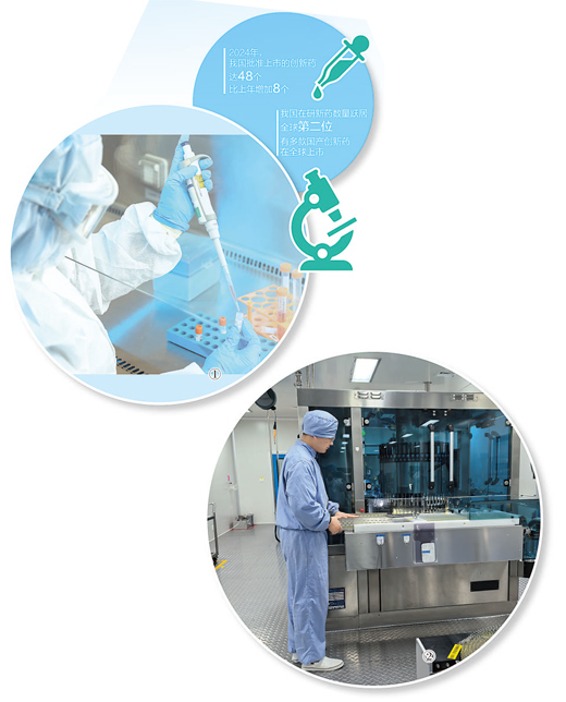 图①:复星医药研发人员正在做实验。 复星医药供图 图②:江苏紫龙药业有限公司生产车间内,工人在生产小容量注射剂。 记者申少铁摄 由我国研究团队耗时8年研发的一款脑细胞保护创新药去年底获批上市,用于改善急性缺血性脑卒中所致的神经症状、日常生活活动能力和功能障碍;上海浦东新区两款创新药近日获批上市,分别用于卵巢癌和成人2型糖尿病治疗…… 国家药监局数据显示,2024年,我国批准上市的创新药达48个,比上年增加8个。我国在研新药数量跃居全球第二位,有多款国产创新药在全球上市。 “10年来,我国医药产业快速发展,医药研发创新活力显著提升,越来越多的创新药获批上市。”清华大学药学院研究员、博士生导师杨悦说。 瞄准临床需求,产学研医深度协同 18年前,苏慰国回国投身自主创新药领域刚两年,在上海浦东新区张江科学城一间咖啡馆内,经历了无数次“失败”的他突然灵感迸发,于一张餐巾纸上画下新的化学结构式,成为呋喹替尼的原型。 呋喹替尼是和黄医药历经12年中国研发、5年全球临床试验、超20亿元投入研发的创新药,于2018年9月在国内获批上市,是我国首款自主研发的抗结直肠癌新药。截至2024年底,已在中国(含港澳)、美国、欧盟、日本等12个全球市场获批上市。呋喹替尼海外上市第一年,销售额即达2.9亿美元,全球临床需求潜力很大。 “2006年以来,和黄医药在研发上始终坚持自己的目标和策略,即布局覆盖主要瘤种产品管线。”担任和黄医药首席执行官兼首席科学官的苏慰国说,比如结直肠癌一直以来在全球都缺乏有效的治疗药物,呋喹替尼为解决这一医学难题提供了新的治疗策略。在和黄医药现有的产品管线中,在研产品覆盖了大部分的肿瘤和联合适应症研究,7个创新药物的逾15项研究,将支持提交新药上市申请。 如何选择药品研发方向?“首先应该聚焦未满足的临床需求,即患者需要什么药,我们的创新研发就重点攻克这些领域。”上海复星医药(集团)股份有限公司执行总裁、全球研发中心首席执行官王兴利说,复星医药瞄准临床需求,已上市10余款创新药,为乳腺癌、肺癌等疾病患者提供更多治疗选择。 开展产学研医融合创新研究是和黄医药成功的重要秘诀。目前,和黄医药共覆盖12条自主研发管线的100余项临床前后和真实世界研究项目,正在多家医疗机构进行,获上海多项产学研医联合研究课题等支持。 脑细胞保护创新药先必新的问世,也是注重临床需求、坚持产学研医协同创新的结果。 卒中俗称“中风”,分为缺血性卒中和出血性卒中,我国卒中患者六成以上是缺血性卒中。“对急性缺血性卒中的脑细胞保护治疗,是半个世纪以来的世界难题。脑细胞死亡越多,未来残疾风险越高。”国家神经系统疾病医疗质量控制中心主任、首都医科大学附属北京天坛医院院长王拥军说。 先必新由神经与肿瘤药物研发全国重点实验室、北京天坛医院、先声药业集团有限公司等联合研发,是中国研究者创造性解决脑细胞保护这一世界性难题的中国方案。 “药品研发没有固定的模式,关键要从临床需求出发。”杨悦认为,从国际药品研发经验看,原创药都是从临床开始的。医生在治疗疾病中缺乏有效的药物,就是药品研发的方向和动力。当前,大医院对临床试验越来越重视,临床试验能力不断提升,为创新药研发合作提供了更大机遇。 加大研发投入,吸纳全球研发人才 “创新,是恒瑞的生命线。没有技术创新,就没有恒瑞的今天。”江苏恒瑞医药股份有限公司董事长孙飘扬说。得益于科技创新,恒瑞医药从一家生产紫药水的小药厂成长为中国制药行业的龙头企业。 自2011年以来,恒瑞医药已有18款新分子实体药物(一类新药)和4款其他创新药(二类新药)在国内获批上市,另有90多个自主创新产品正在临床开发、约400项临床试验在国内外开展。 创新药研发既“烧钱”,也耗时间。通常10亿元的研发投入,耗时10年只有10%的成功率。新药研发投入大、周期长、失败风险高,药企面临巨大考验。 恒瑞医药成立以来,始终把科技创新作为第一发展战略,持续加大投入力度,累计研发投入超400亿元。其中,2021年、2022年、2023年研发投入均突破60亿元,占营收比保持在20%以上,2024年上半年累计研发投入38.60亿元,同比增长26.23%。 复星医药在研发投入上也不遗余力。2023年,复星医药研发投入共计59.37亿元,2024年前三季度研发投入39.15亿元。王兴利介绍,在自研投入的同时,复星医药实施开放式研发模式,通过发起设立和管理产业基金等方式开展研发项目的孵化和投入,确保药品创新研发的可持续性。其中,新药创新基金参与方包括社会资本和地方政府等,首期规模15亿元,孵化了10家创新药企。 人才是研发的根本力量。药企在加大投入的同时,也不断强化研发人才队伍建设。 恒瑞医药在中国、美国、瑞士等国家设立了14个研发中心,全球研发团队超5500人,占公司总人数比重超1/4,其中近60%拥有硕士及以上学历,许多人有在跨国制药公司和研究机构工作经验。 复星医药研发人员超过3400人,其中超1800人拥有硕士及以上学位。复星医药成立全球研发中心,对创新药研发团队及产品管线进行统筹管理。 如何激励研发人才?恒瑞医药在保障创新药研发的延续性和稳定性基础上,建立起鼓励创新的管理体系,形成支持大胆探索、鼓励担当作为的鲜明导向。复星医药针