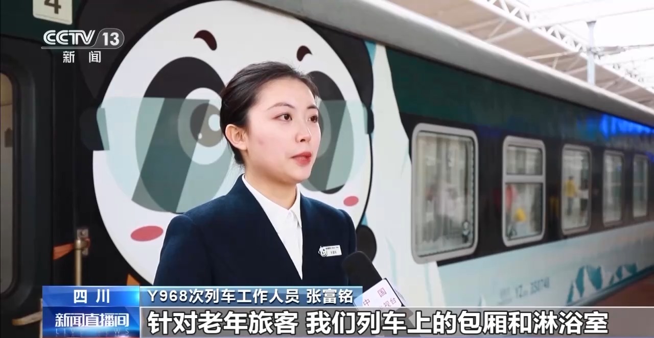 Y968次列车工作人员 张富铭:针对老年旅客,我们列车上的包厢和淋浴室都增设了加宽护栏、防滑扶手及地垫、紧急呼叫器、热水洗脚喷头、可折叠椅凳等。