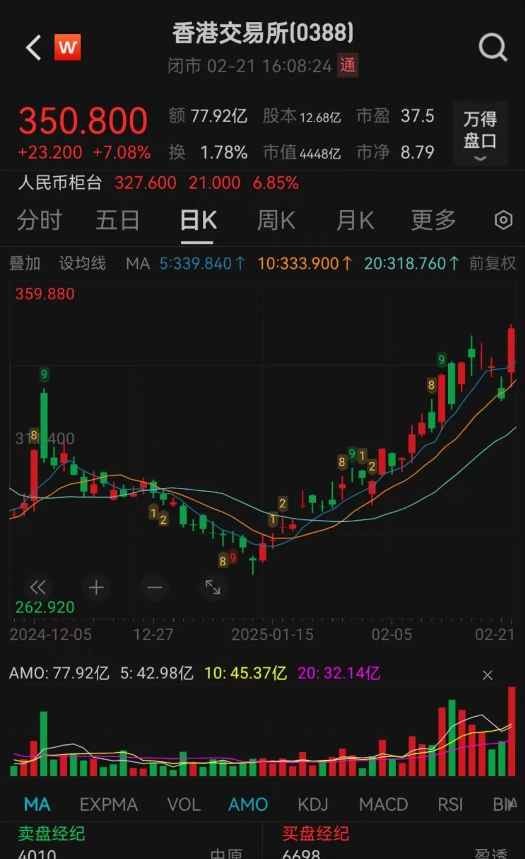 根据香港交易所的数据,在新的收费结构下,2019年至2024年间约77%的市场交易将支付较低的费用。 据港交所透露,新的收费结构已获香港证监会批准,待市场准备就绪后于2025年6月实施,并在收窄买卖价差的第一阶段实施之前生效。在收窄股票买卖价差后,或会促成更多成交金额较小的交易,从而令投资者受益于新的费用结构。 《香港结算一般规则》亦将适时作出相应修订。 提高市场活跃度和竞争力 香港交易所首席营运总监及集团首席财务总监刘碧茵表示,“香港交易所致力于为全球投资者提供一个活跃和高效的市场,我们很高兴优化股份交收费结构,令有关收费更为清晰及一致,对不同成交金额的交易都更为公平,让散户和机构投资者更灵活地执行其交易策略。” “这次的调整亦是我们增加证券市场深度及广度的工作之一,巩固香港作为领先国际金融中心的地位。”她说。 一位业内人士分析,这一降费举措影响深远。对投资者而言,可以直接减少个人交易费用,提升投资收益,还让专业及机构投资者的策略更灵活。 “例如,一位频繁交易的小散户,在以往较高的交易费用标准下,每次交易支付的费用长期积累下来是一笔不小的开支。而新收费结构实施后,每笔交易费用降低,同样的交易操作,成本支出明显减少,这无疑增加了投资者的实际收益。其次,对于专业投资者和机构投资者来说,交易成本的降低使他们在制定投资策略时有了更大的灵活性。”上述业内人士称。 从市场角度看,交易成本降低会吸引更多投资者入场参与交易,包括国内外潜在投资者,提升市场整体活跃度和流动性。 长期来看,降低交易成本将有助于吸引更多长期资金进入市场,吸引更多国际投资者参与,提升市场竞争力,巩固香港的国际金融中心地位。 港交所股票大涨 Wind数据显示,2月21日,港交所盘中一度涨7.39%,报351.8港元,创去年10月8日以来新高;最终收涨7.08%,报350.8港元,创4个多月以来新高,总市值突破4400亿港元。 消息面上,摩根士丹利将恒生指数的年底目标位从19400点上调至24000点,还将恒生中国企业指数的年底目标位从6970点上调至8600点。