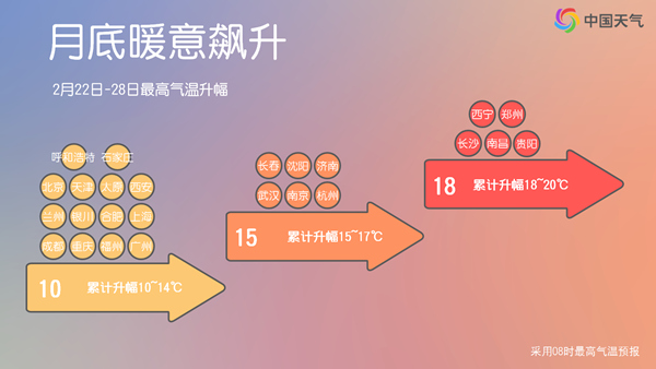 27日至28日将是本次大回暖的鼎盛阶段,中东部气温将显著偏高,南北方多地将创今年新高,最高气温10℃线将北抬到辽宁北部,黄淮及其以南将有大片20℃+、25℃+。 最低气温也将逐步回升,28日前后最低气温0℃线退至河北北部至山西中部,南方多地最低气温将回升到10℃以上。 大城市中,济南、郑州、合肥、武汉、南京、杭州28日都有望迎来今年首个20℃+,沈阳、呼和浩特、银川、西宁也将迎来今年首个10℃+。