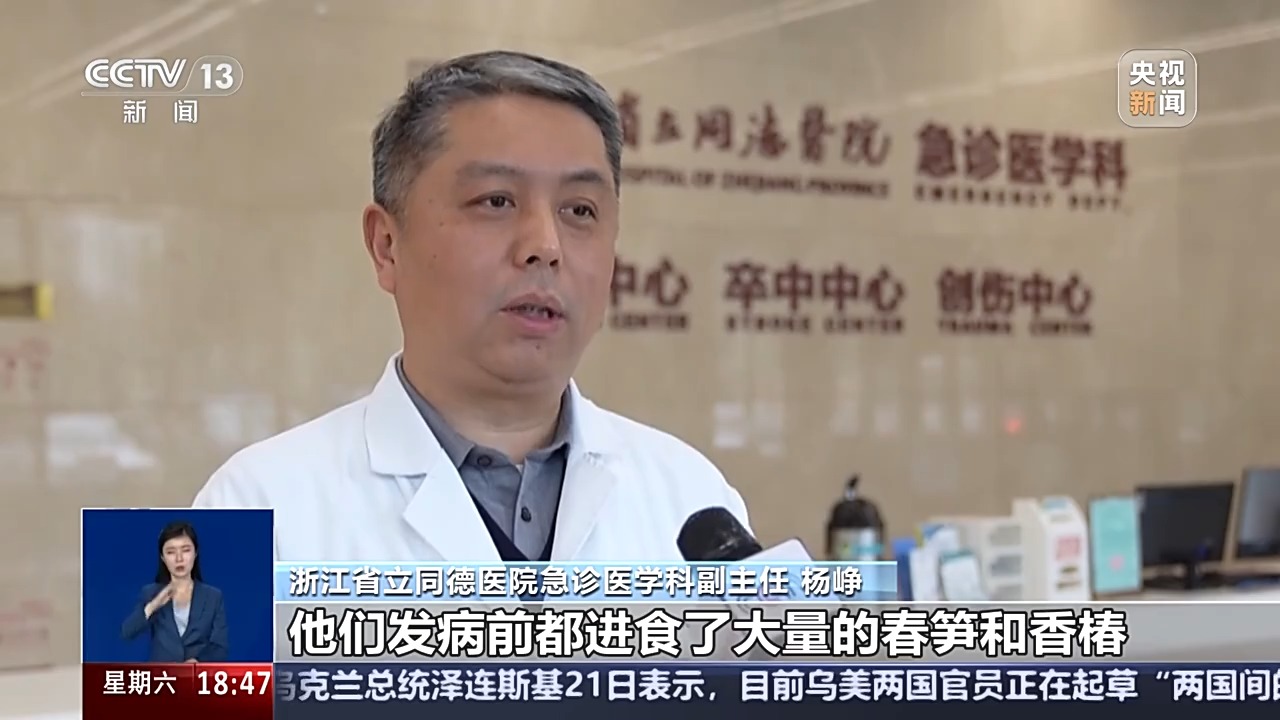 浙江省立同德医院急诊医学科副主任 杨峥:我们询问了病史,他们发病前都进食了大量的春笋和香椿,一顿都吃了300克以上的春笋,有不同程度的晕厥、胸闷。随后我们发现了他们有黑便的情况,所以经过后来的诊断、内镜检查,确诊他们是有消化道出血的。 无独有偶,杭州师范大学附属医院消化内科近日也接诊了因吃春笋引发不适的患者。
