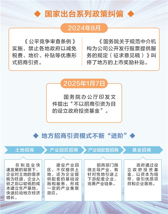 证券时报记者 卓泳 从清理涉税招商、叫停地方各类奖补招商引资,到规范“基金招商”,在构建全国统一大市场的背景下,国家层面在不到一年时间内接连出台多项政策,规范地方招商引资法规制度,严禁违法违规给予政策优惠行为,许多地方长达10多年的传统招商模式因此受到挑战,招商思路也亟待革新。 事实上,地方政府的招商引资经历了多个阶段的“进阶”,从依赖行政资源逐步转向借力市场力量。如今,在打破招商“内卷”的政策指引下,如何适应招商新常态、探索创新招商方式,已成为各地政府面临的重要课题。 近期调研中,多位地方一线招商人员表示,长远来看,叫停过度行政化的招商方式能为地方招商“减负”,促使招商回归理性,推动地方政府着力打造优质营商环境。此外,业内人士还指出,打破招商“内卷”不仅需要让招商方式回归市场化,还需通过多元化的产业政策引导地方发展差异化产业,避免产业扎堆和公共资源的浪费。 1 地方招商引资模式不断“进阶” 从一块土地到一个产业园区,再到一个政策、一只基金……回溯近十几年,地方政府招商引资的模式不断进阶,从土地财政走向股权财政,从投入行政资源逐步探索借力市场化力量,背后是传统招商方式的难以为继,以及产业结构转向所迸发出的新需求。 “十几年前,地方政府的招商方式很简单,低价出让一块地,再给予税收减免等,就能吸引企业入驻了。”杭州一区级政府招商人员王爽(化名)对记者感慨,她从事了10年地方招商引资工作,明显感觉到这些年招商工作强度越来越大,也越来越难。 不可否认的是,以土地招商为主的模式在发展初期效果显著,尤其是在制造业快速发展的背景下,企业对土地的需求极为旺盛,企业入驻之后以较低的成本建立生产基地,快速拉动地方经济增长,极大解决就业问题,推动了许多地方工业化的进程。 然而,随着产业结构升级,土地资源、环境容量等要素制约也日益凸显,地方政府开始意识到单一的土地招商难以满足企业的多样化需求。于是开始建设产业园区,不仅提供土地,还为企业提供配套的基础设施和服务,形成了一定的产业集聚效应。“产业园区的建设使得企业能够在区域内形成产业链上下游的协同效应,降低了企业的运营成本。”深汕合作区招商专员葛明(化名)对记者表示。 而产业链配套招商则是在产业园区招商的基础上进一步深化,更注重产业链的完整性和协同性。招商部门围绕主导产业,有针对性地引进上下游配套企业,完善产业链条,企业在本地就能找到大部分的供应商和合作伙伴,从而增强了企业对地方的黏性。 如今,基金招商已成为主流的招商方式之一,政府通过设立政府投资基金,以资本为纽带,吸引优质项目和企业落地。 中国(深圳)综合开发研究院院长助理、数字经济与全球战略研究所所长曹钟雄接受证券时报记者采访时分析,地方政府招商模式的不断变迁,既有产业结构调整的驱动,也有地方政府在经济发展中的角色转变。而在北京大学光华管理学院金融学系主任刘晓蕾看来,从简单的资源投入到更加注重产业生态建设和市场化运作,体现了地方政府在招商理念和方式上不断进步,也更加专业和市场化。 2 长期利好地方招商回归理性 招商引资一直是各地政府发展经济的重要抓手,即便过去十多年来,地方招商引资模式不断推陈出新,传统招商模式遇到挑战,但在特定历史阶段所产生的效益依然值得肯定。 “全球各国各地政府都会投入不同程度的行政手段和资源来为地方争取优质企业等生产要素,过去的土地、税收等招商方式也确实很大程度上促进了地方经济发展。”曹钟雄认为,要辩证地看待地方政府过去的招商方式,承认其带来的成效,同时反思其中的问题。 问题是什么?受访人士均指出:过度使用公共资源。“适度的政策、基金工具有利于营商环境的打造,但如果迫于指标压力,给予远高于产出预期的政策和带有过重行政色彩的非理性投资,就可能造成财政或国资的浪费,侵占社会公共资源,其中也可能有寻租空间。”王爽表示。 以当前主流的基金招商为例,刘晓蕾认为,基金招商受地方经济发展目标制约,阻碍企业跨区域发展,不符合全国统一大市场建设理念。此外,受产业政策同质化影响,地方争夺相同领域的优质项目,“内卷式”招商不仅造成财政损耗,还造成部分产业产能过剩。 针对这些问题,国家出台了一系列政策,对一些“不经济”的招商方式进行“纠偏”。2024年8月《公平竞争审查条例》实施,禁止各地政府以减免税费、地价、补贴等优惠形式招商引资;同月,《国务院关于规范中介机构为公司公开发行股票提供服务的规定(征求意见稿)》叫停了地方的上市奖励补贴;2025年1月7日,国务院办公厅印发文件提出“不以招商引资为目的设立政府投资基金”。“这些措施都旨在引导地方摒弃简单粗暴的招商方式,促使地方思考长远发展,提升招商质量,实现更市场化的资源配置。”刘晓蕾表示。 但这些政策也给地方招商带来“阵痛”,最直观的体现是,各种限制和规管将让不少地方的招商失去“抓手”。“原来对重大招商引资项目,可给予‘一事一议’政策,现在只能给予普惠政策。”王爽告诉记者,以往地方政府会为某一个大企业的入驻专门开会商讨决策给予“特殊待遇”,但如今这条路行不通了,招商指标就更难完成。 “阵痛”之余,