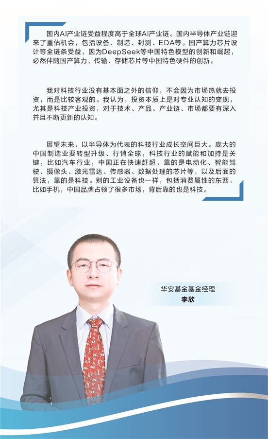 证券时报记者 杨波 “DeepSeek改变了AI的产业范式,对科技股的投资产生重大影响。”华安基金基金经理李欣表示。 李欣本科在浙江大学竺可桢学院学习,专业为半导体设计,研究生和职业生涯的前几年主要从事电力电子和能源高效应用的工作,这为他后来的投研工作打下了坚实的基础。2009年李欣加盟华泰证券任电子分析师,2012年加盟华安基金,2015年开始管理基金,他长期坚持在科技赛道投资,并获得了优良的投资业绩。以他管理时间最长的华安智能装备基金为例,从2015年7月9日至2025年1月31日,该基金获得的回报为231.7%,年化回报为13.34%(同期业绩比较基准为4.84%)。 李欣是如何穿越市场周期并获得长期良好的投资收益?对当前爆火“出圈”的DeepSeek,他怎么看?AI带来的技术革命,是否已超越互联网?日前,证券时报记者采访了李欣,就相关问题进行了坦率、深入的交流。 1 科技产业将加速成长 证券时报记者:DeepSeek爆火“出圈”,对此,你怎么看? 李欣:DeepSeek爆火并非偶然,对于同为浙大电子信息类专业出身的幻方和DeepSeek团队,他们从量化交易积累而来的算力资源池、硬件调优能力、AI模型构建和优化能力对构建高效率的DeepSeek模型帮助很大,任何成功都不是一蹴而就,而是日积月累的结果。近五年来,我也在摸索和构建将主动投研和AI结合的路线,受启发于Transformer等AI算法,希望可以从各个维度、深度更加全面地解构和理解市场、行业、个股的运行逻辑,希望做到基本面和“模型面”的相互解释和印证,从而提高投资绩效。 我个人以为,人类对自然规律(包括语言、视频等)的认知和表达,经历了三个阶段:一是文字描述,例如“太阳东升西落”。二是数学解析式和方程,例如牛顿定律和麦克斯韦方程组,这两个阶段本质上都是归纳、推理、验证。三是AI大模型,将研究的客体映射到高维空间,让其各类特征得以充分表达;经过深度上的层层递进,用一系列的线性变换和非线性函数,充分表达其内在逻辑的复杂性;通过对海量案例的训练,使模型的表达趋近现实。这是方法论上的巨大进步,也是目前对大模型很多争论的来源,因为它并不符合千百年来科学发现的基本流程和框架。 证券时报记者:DeepSeek对科技股投资产生了什么影响? 李欣:DeepSeek对科技股的投资产生重大影响。首先改变了AI的产业范式,OpenAI代表的是海量数据+高端算力的军备竞赛式资本密集型范式,DeepSeek代表的是算法+硬件+软件应用三位一体注重系统整体效能的范式,系统创新可以弥补单点不足,比如硬件算力的短板,这就系统性重估了国内科技产业的价值,国产模型和国产算力互相优化、匹配、提升。从训练端向推理端,从云端到终端,从算力到应用,都在呈现接力成长、加速成长。 与十年前的移动互联网相比,从技术革命的角度看,AI超越了移动互联网;从产品和盈利模式创新的的角度看,目前AI还是基于既有的商业模式例如云计算、短视频、本地生活、电商做产品的加成和升级,笑到最后的AI原生应用还有待出现,这符合产业发展规律。 2 国内AI产业链受益程度更高 证券时报记者:随着人工智能概念持续火爆,你在当前布局时,主要关注哪些要素?后续看好哪些细分赛道,主要逻辑是什么? 李欣:行业发展初期,关注产业卡位和既有资源在AI时代的变现能力;然后是业务和AI的结合程度,业务的推进进度以及可持续变现能力。一是看好AI的“使能者”:国产算力,包括高端半导体制造、算力/传输芯片设计等产业链;全球算力产业链在技术创新推动下量价齐升。二是看好受益于“AI平权”的行业:智能驾驶、机器人等,包括整机(整车)、系统集成、关键零部件如算力芯片、激光雷达、传感器、执行器等。 证券时报记者:DeepSeek对于AI产业的意义是什么? 李欣:对于全球AI产业,此次DeepSeek的成功标志着大模型的降价放量,因此推理端放量,增速高于训练端;终端侧受益于AI的放量降价,优于云端;应用端增长也加速。所有和放量相关的环节都受益,如推理端芯片和硬件(其相对于训练端,制程和价格都较为亲民),终端硬件(眼镜、手机、机器人、智能驾驶等,以及SoC芯片),C端应用软件如办公自动化、教育、游戏、传媒等,都将受益。 证券时报记者:DeepSeek对于我国科技产业有何影响? 李欣:国内AI产业链受益程度高于全球AI产业链。DeepSeek的成功,证明AI产业的竞争不是依靠单纯的算力高低,而是依靠算法、软件、硬件三位一体的综合匹配实力,国内在最高端半导体制造上有短板,但DeepSeek可以依靠算法和软件的补齐,用国内产业已经实现的次高端半导体加以协同,同样可以在综合效能上做到全球第一梯队。因此国内半导体产业链迎来了重估机会,包括设备、制造、封测、EDA等。国产算力芯片设计等全链条受益,因为DeepSeek等中国特色模型的创新和崛起,必然伴随国产算力、传输、存储芯片等中国特色硬件的创新。 3 投资本质是对专业认知的变现 证券时报记者:近年来你们是怎样对AI领域进行投资和研究的? 李欣:2022年10月,美国出台了管制AI芯片对华出口的政策,从那天起,我们开始加强对国内AI算力芯片的研究和投资,下大力气调研AI算力芯片现状。2023年1月,ChatGPT爆火,我们请教了很多专家,读了很多报告,重点研究AI从技术到产品的突破,海外公司注重既要出产品又要出论文,在一些公开的平台可以看到相关论文,我们学习之后觉得还是蛮惊艳的。我们同时